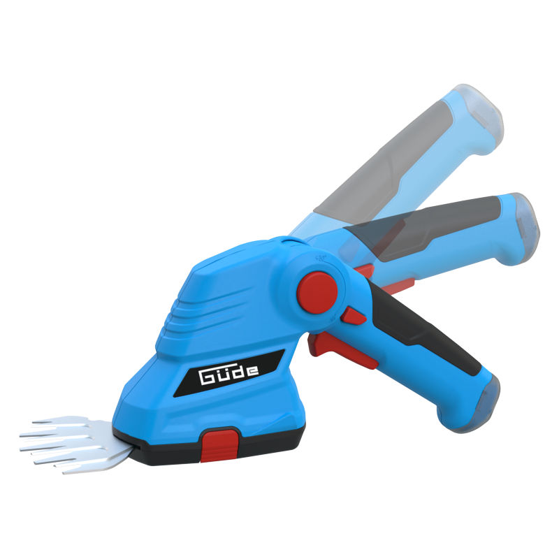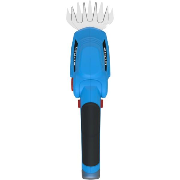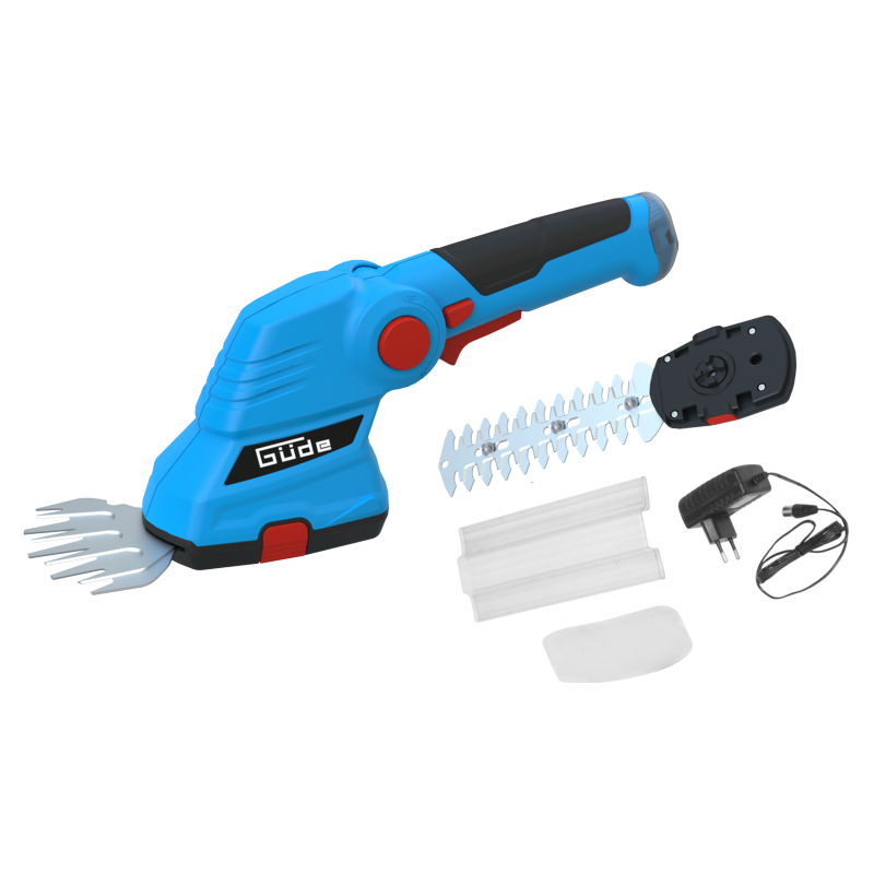 Akumulátorový záhradnícky set s násadou na strihanie trávy, násadou na strihanie živých plotov a kríkov, integrovaným akumulátorom 7,2 V / 1,5 Ah, vrátane nabíjačky. Trojpolohová sklopná rukoväť, rýchla výmena nožníc na trávu alebo nožníc na živé ploty/kríky bez použitia náradia. Čas nezaťaženého voľnobehu nožníc na trávu približne 55 minút a násady na strihanie živých plotov a kríkov približne 85 minút.