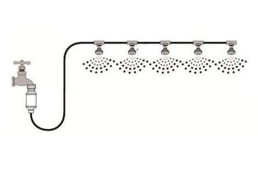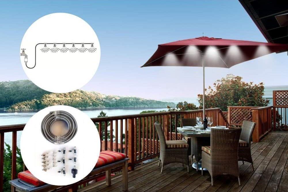 - Sada na vytváranie ochladzujúcej vodnej hmly obsahuje 5 mikrotrysiek s nastaviteľným uhlom pôsobenia (z toho jedna koncová), 7,5 metra hadice, ktorej nastrihaním je možné umiestniť trysky podľa individuálnej potreby, 5 závesných klipov a adaptér na vodovodnú prípojku.