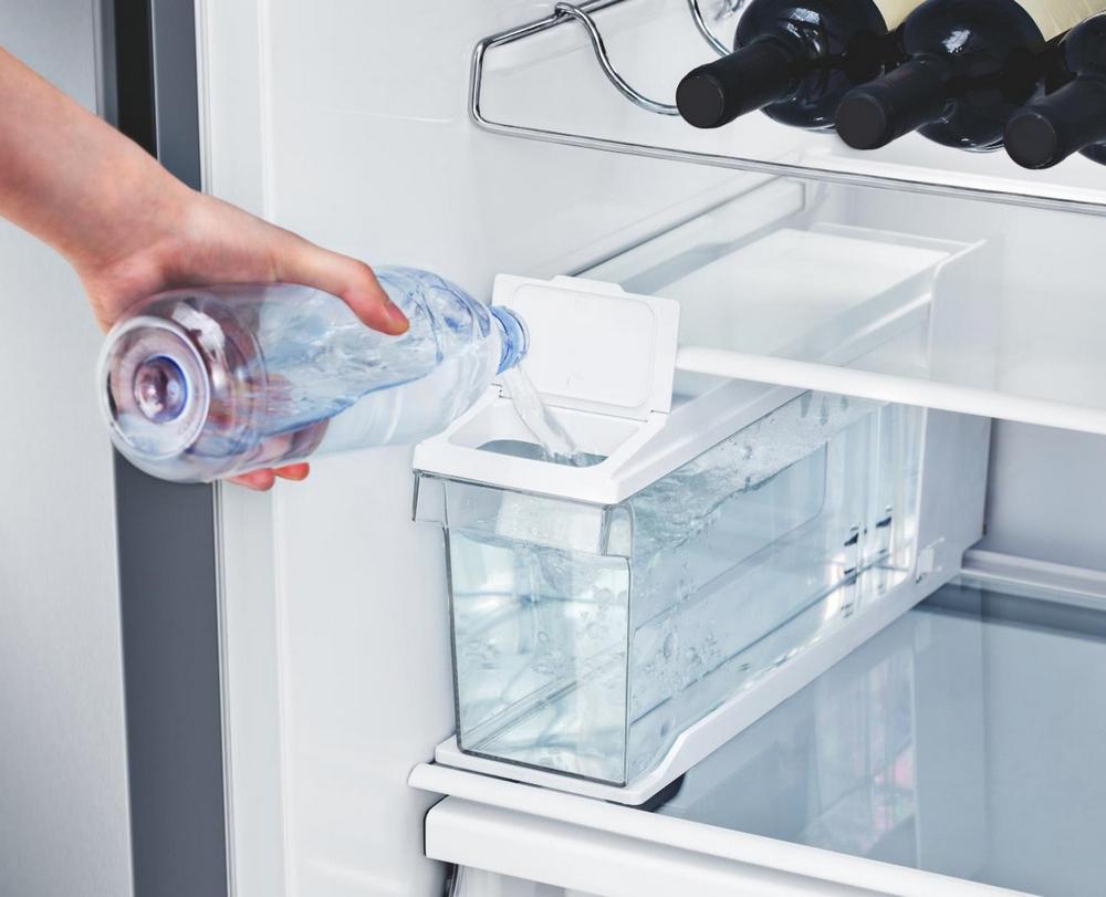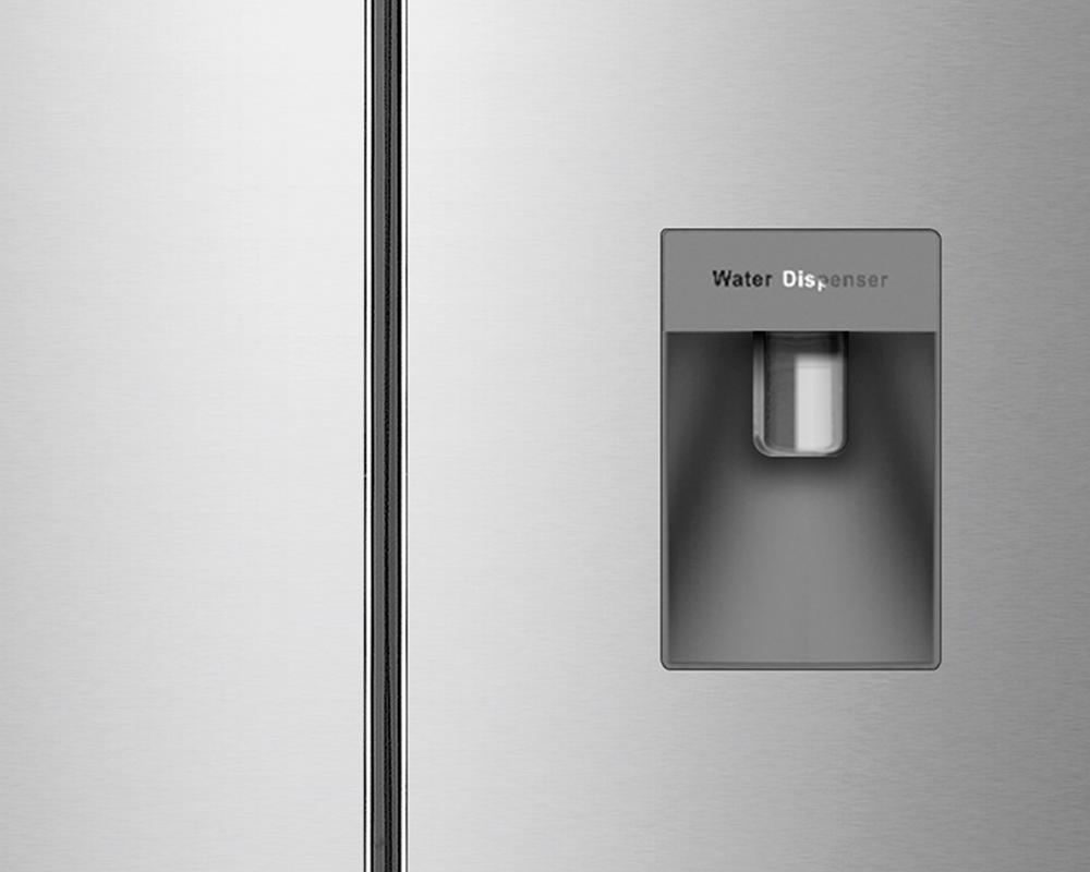 Americká chladnička HISENSE RS694N4TIE disponuje vyberateľným dávkovačom vody. Jeho výhodou je, že v chladničke nezaberie veľa miesta, ľahko sa čistí, a hlavne dávkovač nemusíte pripájať na vodovod. Zabudovaný zásobník pojme 4 litre vody.