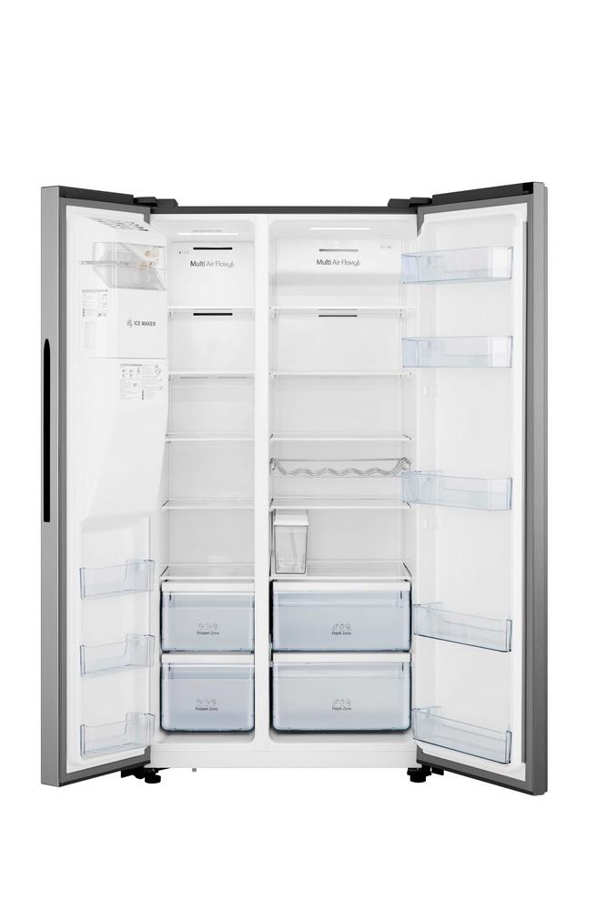 Sme si istý, že do akéhokoľvek interiéru skvele zapadne nová, dvojdverová americká chladnička Hisense RS694N4TIE, ktorá ponúka objem 371 litrov a mraznička vás poteší objemom až 185 litrov. Najväčšou prednosťou americkej chladničky je beznámrazová technológia Total No Frost, ktorá sa za vás postará o neobľúbené odmrazovanie. Chladnička spadá do novej energetickej triedy E, ktorá šetrí energiu a vašu peňaženku a vďaka inteligentnému systému Multi Air Flow, vo vnútri rovnomerne cirkuluje studený vzduch. V prípade, že necháte dvere chladničky otvorené, upozorní vás praktický alarm. Bez obáv o vaše potraviny a o spotrebu vašej chladničky, zvoľte pred odchodom na dovolenku funkciu Holiday. Prevažne v letných mesiacoch oceníte praktický dávkovač vody a výrobník ľadu, ktorý skvelo zapadá do dizajnu americkej chladničky.