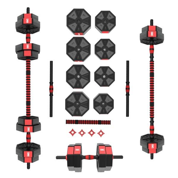 Kompletná nakladacia sada dvoch jednoručných a jednej obojručnej činky s celkovou hmotnosťou 15 kilogramov, to je HMS SGC15. Nakladacie činky patria ku klasickému vybaveniu každej domácej posilňovne. Kotúče sú vyrobené z tvrdého plastu, ktorý je vyplnený cementom. Obojručná os je spojovacím dielom, do ktorého sa vskrutkujú hriadele jednoručných činiek. Nakladacie tŕne sú opatrené závitom a závažie sa zaisťuje pomocou hviezdicových matíc. Šesťhranný tvar kotúčov navyše zamedzuje ich odvaľovaniu. Činky sa Vám tak nikam neodkotúlia a budete ich mať vždy tam, kde ste ich odložili.
