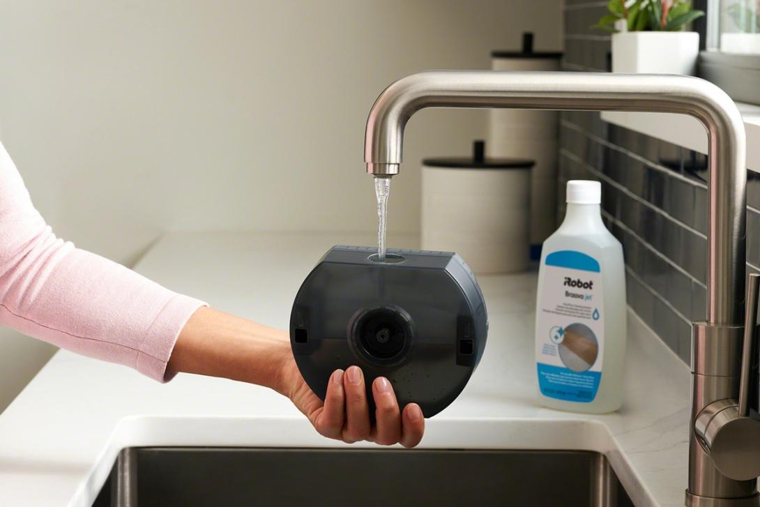 Nasaďte čistiacu podložku, naplňte nádržku vodou a stlačte tlačidlo CLEAN. Pre dlhotrvajúcu sviežu vôňu pridajte Braava jet čistiaci prostriedok na pevné podlahy.