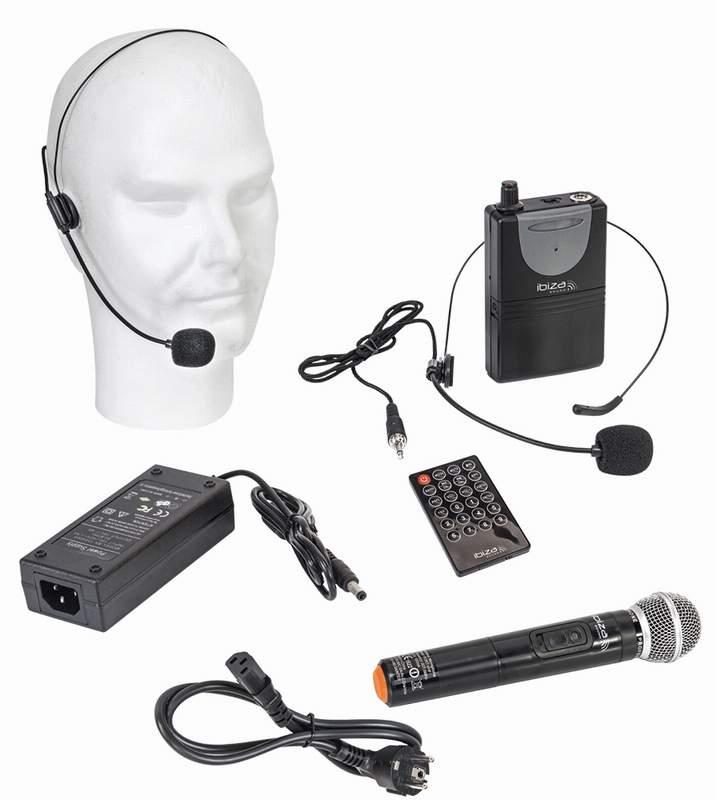 Profesionálne UHF bezdrôtové mikrofóny (ručný a náhlavný) zaisťujú všestrannosť a volnosť pohybu bez nežiadúceho rušenia. Prehrávač systému sa dá ovládať aj priloženým diaľkovým ovládačom. K jednoduchosti použitia napomáha prehľadný podsvietený LCD displej.