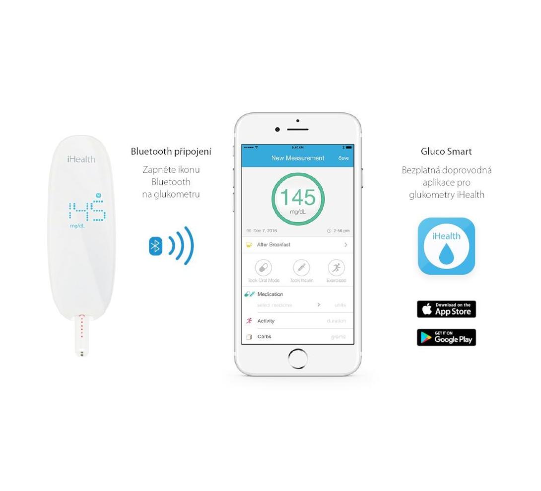 Meranie glykémie s novým glukomerom iHealth GLUCO+ prebieha podobne, ako u klasických glukomerov. Navyše ale pridáva chytré využitie digitálnych dát . Bezplatná aplikácia Gluco Smart nahrádza a vylepšuje papierový diabetický denník. Do vášho smartfónu, tabletu alebo počítača prináša automaticky a prehľadne spracované údaje.