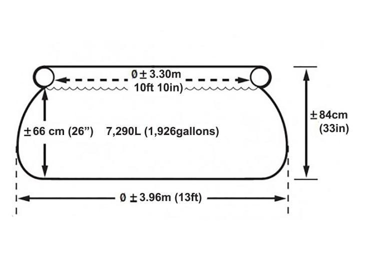 Nafukovací bazén pre povrchové umiestnenie, obsah vody: 7290 L vody pri 80% napustení, výkon filtrovacieho zariadenia: 2006 L / HOD
