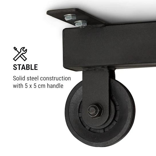 Posilňovací stroj, stabilné: pevná oceľová konštrukcia s 5 x 5 cm žrďou, vysoká nosnosť: 35 x 2,5 cm (DxØ) úchyt na závažia s nosnosťou až 150 kg