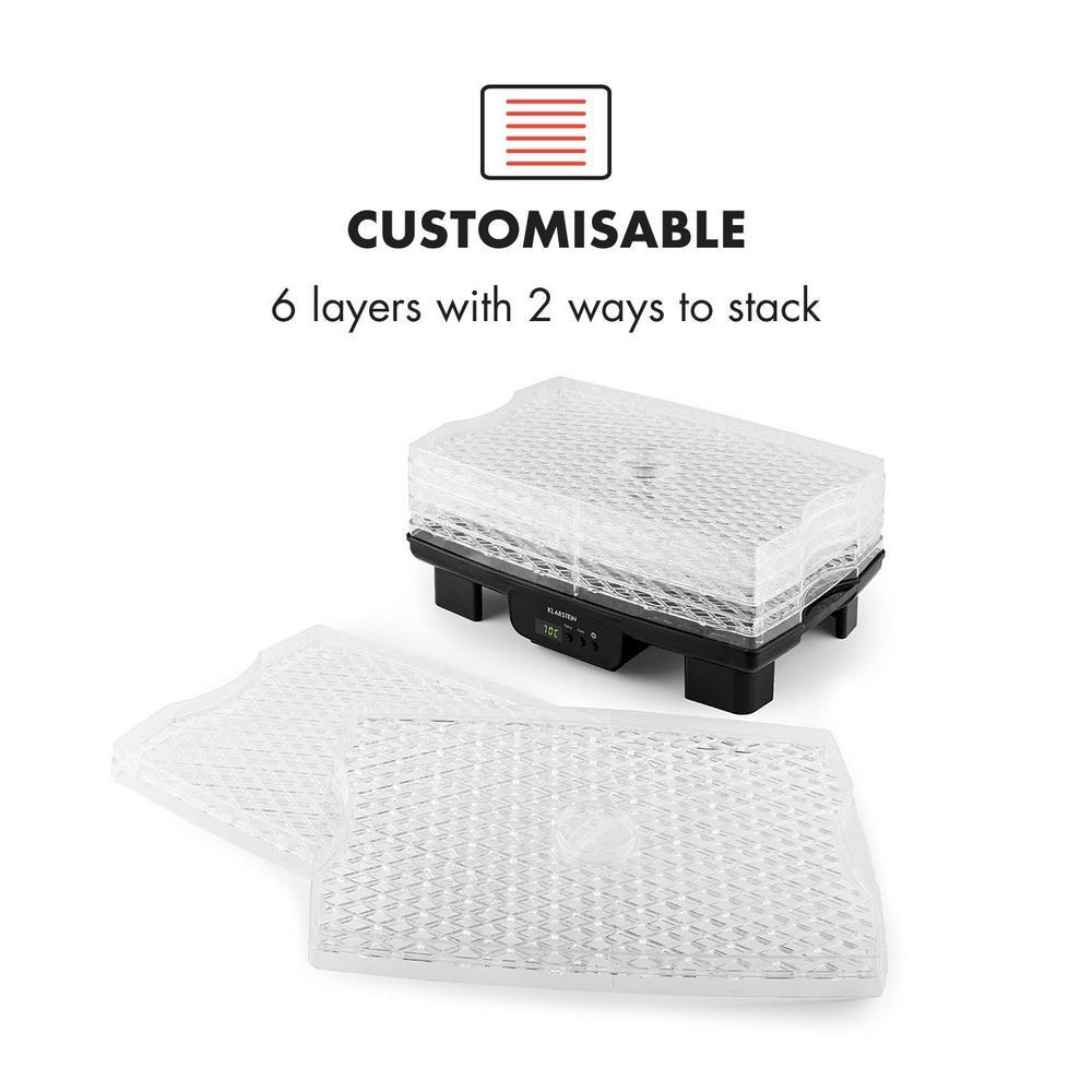 Na celkovo 6 poschodiach sú šetrne sušené kúsky ovocia, plátky zeleniny, huby a byliny. Aj veľké ryby a celé plátky mäsa môžete hravo spracovať zo zariadením Klarstein Bananarama - týmto spôsobom si môžete sami pripraviť lahodný Beef Jerky. Nástavec s jemným sieťovaním je obzvlášť praktický napríklad pre bobuľovité ovocie. Priedušné nástavce umožňujú v spojení s cirkuláciou vzduchu rovnomerné rozloženie tepla. Vďaka variabilnému rozloženiu sa dajú spracovať napríklad aj kusy rýb bez predchádzajúceho rozkrájania. Po použití a krátkom vyčistení sa zásobníky sušičky priestorovo úsporne vkladajú do seba, zariadenie má celkové rozmery 29,5 x 22,5 x 43,5 cm.