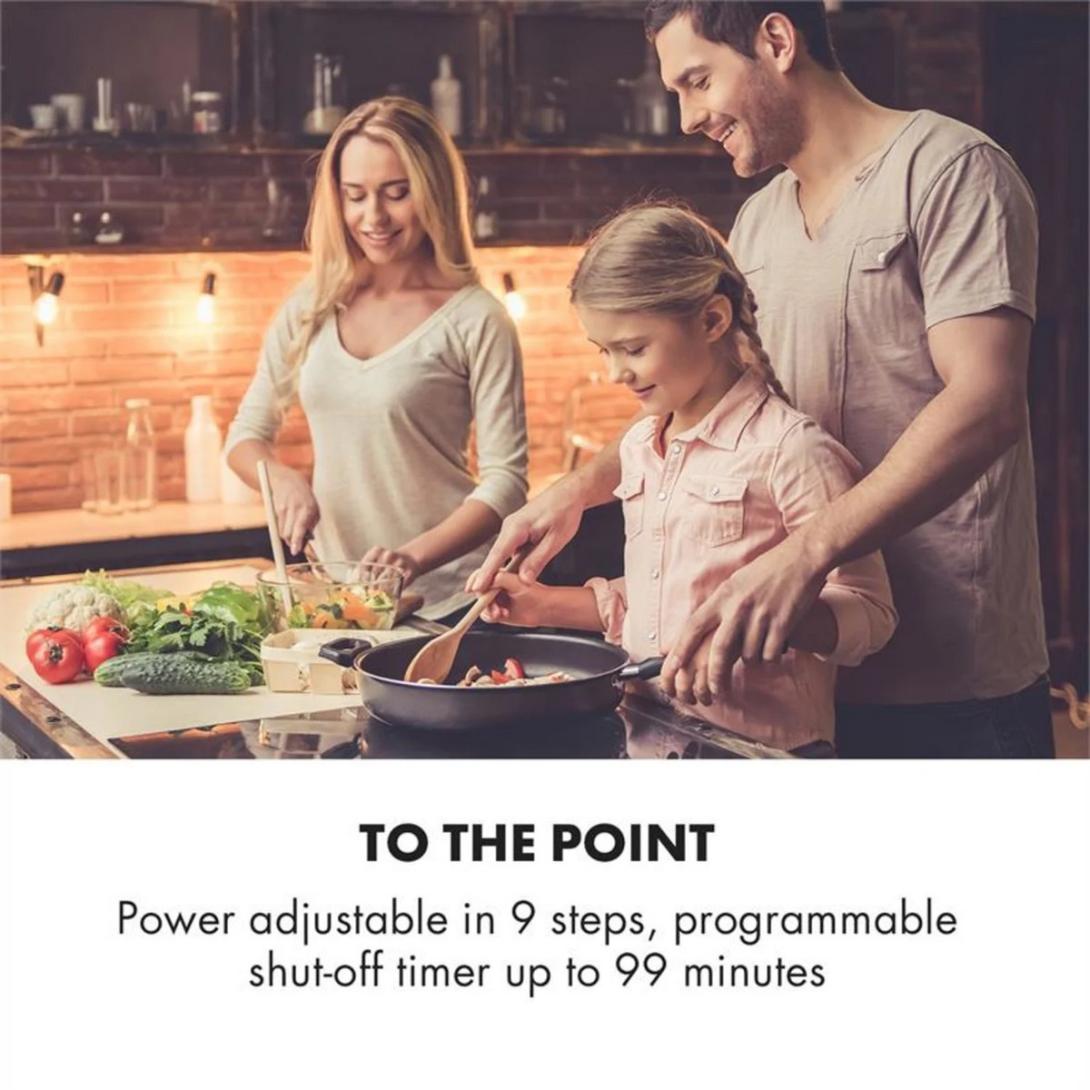 Vstavaná varná doska Klarstein Delicatessa 77 Hybrid ponúka štyri varné platne s celkovým výkonom až 7000 W (2 x 2000 W), ktoré sa rozdeľujú na 2 x 2000 W a 2 x 1500 W na jednotlivých varných plochách - vďaka čomu obsah hrncov a panvíc zovrie v špičkových časoch. Pritom sa zjednocujú obidve ľavé varné zóny do jednej flexi zóny pomocou funkcie VarioHeating: vďaka funkcii rozpoznania veľkosti hrnca sa s maximálnou flexibilitou prispôsobí veľkosti umiestnených hrncov, panvíc alebo kastrólov, a tak sa zohrieva aj veľký kuchynský riad, ktorý sa nezmestí na jednu varnú plochu. Na jednej strane zariadenie Delicatessa 77 Hybrid naozaj využíva len energiu, ktorá je vhodná pre daný hrniec, a na druhej strane umožňuje používať takmer akúkoľvek veľkosť hrnca alebo panvice. Zariadenie Delicatessa 77 Hybrid myslí aj na milovníkov veľkých panvicových jedál, ako napríklad paella. Pravá varná zóna má priemer 28 cm a poskytuje bez problémov dostatok potrebného miesta na veľké panvice. Výkon jednotlivých plôch a flexi plochy je možné ovládať samostatne a majú k dispozícii funkciu ThermoBoost, ktorá zvyšuje výkon s cieľom rýchleho zohriatia na 3000 W. Sklokeramická varná doska Klarstein Delicatessa 77 Hybrid sa jednoducho ovláda pomocou integrovaného dotykového panelu SenseControl s Touch-to-slide ovládaním výkonu posunutím prsta po ploche a pomocou digitálneho displeja. Takže ani gombíky a regulátory nenarúšajú povrch kuchynskej linky. Okrem výkonu sa dá naprogramovať aj časovač až na 99 minút pre každú varnú dosku. Časovač buď vypne varnú dosku po uplynutí nastaveného času, alebo vydá akustický signál.