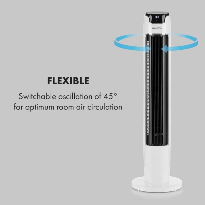 Sila vetra 6: Klarstein Empire State vežový stojaci ventilátor má hneď šesť rýchlostných stupňov, ktoré splnia každé prianie čerstvého vzduchu od jemného vánku až po silné prúdenie. Ventilátor pracuje vďaka novému dizajnu kanála vzduchového prúdu o 36% účinnejšie ako porovnateľné staršie prístroje. Vežový ventilátor sa dostane stlačením tlačidla do 45° oscilácie. Máte na výber tri rôzne režimy ventilácie - okrem bežného režimu aj režim prirodzeného vzduchu a funkcia režimu uspania. Nastaviteľný časovač môžete použiť na automatické zapnutie a vypnutie po 0,5 až 12 hodinách. Klarstein Empire State vežový ventilátor môžete obsluhovať cez zrozumiteľné dotykové ovládacie pole na vrchnej strane alebo úplne pohodlne prostredníctvom dodávaného diaľkového ovládania. Veľký LED displej zobrazuje nastavené parametre a režimy cez zrozumiteľné piktogramy.