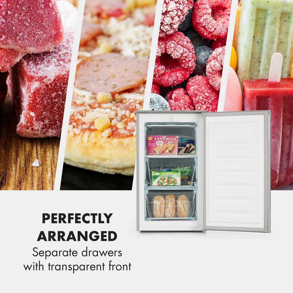 S kapacitou 75 litrov ponúka mraznička dostatok priestoru pre menšie aj väčšie jedlá, mraziaci výkon sa dá pohodlne nastaviť pomocou plynule otočného regulátora vo vnútri zariadenia. Vďaka samostatným zásuvkám s priehľadnou prednou časťou je mrazené jedlo dokonalo rozdelené a hygienicky uložené priestorovo šetrným spôsobom. Čistý dizajn mrazničkyprináša modernú eleganciu, vďaka ktorej sa zariadenie bezproblémovo začlení takmer do každej kuchyne.