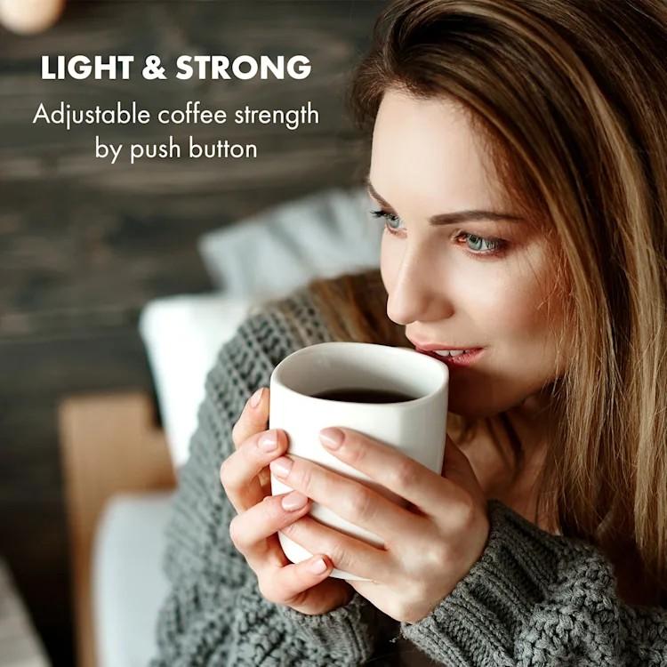 - Ľahký & silný: nastaviteľná intenzita kávy stlačením tlačidla