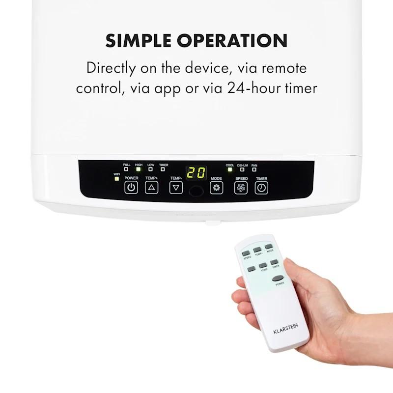 Vďaka aplikácii Klarstein a pripojeniu k sieti WLAN je možné zariadenie Iceblock Ecosmart 9 ľahko ovládať pomocou smartfónu. Horný ovládací panel zaisťuje zasa jednoduché manuálne ovládanie. Dodávaný diaľkový ovládač tiež ponúka možnosť pohodlného ovládania. Či už ide o ovládanie na zariadení, ovládanie prostredníctvom aplikácie alebo pomocou diaľkového ovládača, klimatizácia má k dispozícii množstvo ďalších funkcií, ako napríklad manuálna oscilácia otvoru ventilátora alebo 24-hodinový programovateľný časovač zapnutia/vypnutia. Stavové LED diódy prehľadne zobrazujú, aký výber funkcií bol vykonaný. Pre rýchlu inštaláciu má klimatizácia Klarstein Iceblock Ecosmart 9 v balení dve tesniace sady, jednu pre posuvné okná a jednu pre sklápacie okná. Vzduchová hadica, ktorá sa dá vytiahnuť až do 1,5 m, a kolieska s hladkým chodom uľahčujú výber umiestnenia a tiež premiestnenie klimatizácie.