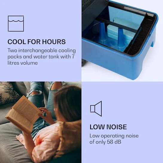 Ochladzovač vzduchu, Prietok vzduchu: 330 m³/h, Objem nádržky na vodu: 7 litrov, Funkcia časovača: 1, 2, 4 a 8 hodín, Prevádzkový hluk min. / max.: 35 / 58 dB