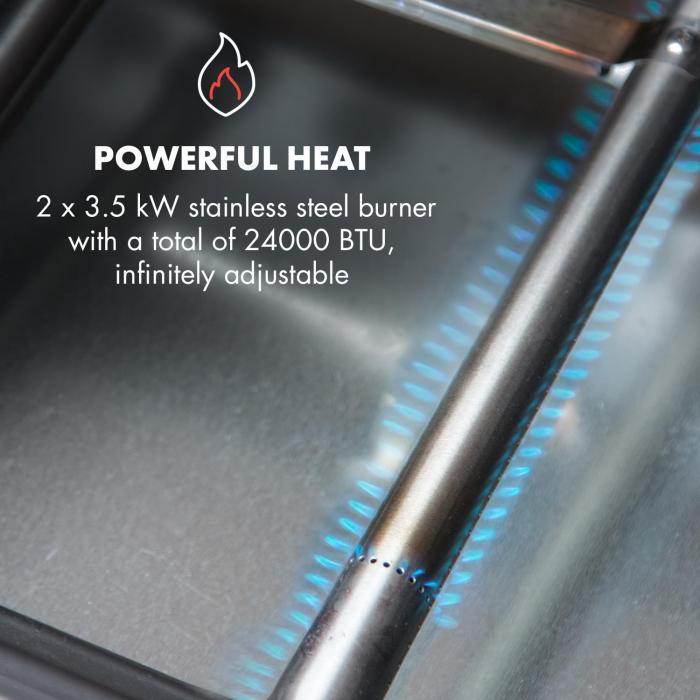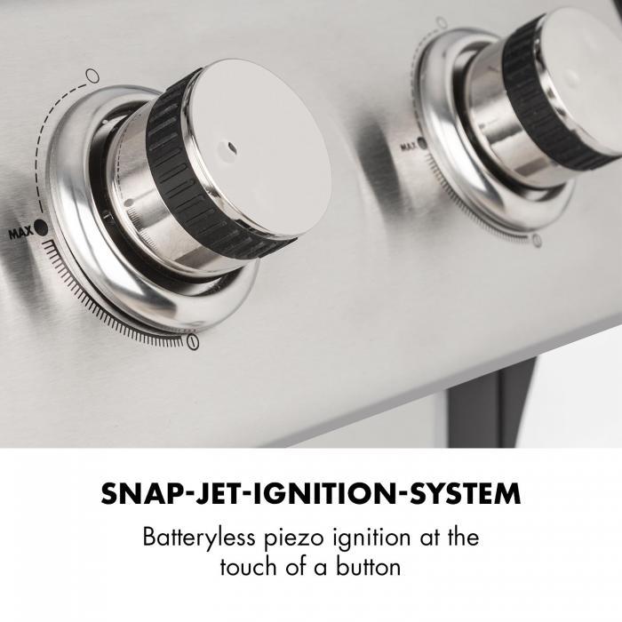 Grilovanie na otvorenom plameni bez prachu z uhlíkov a babračky pri zapaľovaní? S plynovým grilom Klarstein Lucifer 2.0-T je to úplne jednoduché. Vďaka zapaľovaciemu systému SNAP-JET s integrovaným piezo zapaľovaním sa zapáli jeden alebo obidva horáky stlačením tlačidla. Gril pracuje vďaka plynovým horákom s konceptom InstantReady. To znamená, že je ihneď pripravený na použitie, bez toho, aby ste museli dlho čakať na rozžeravenie uhlia alebo rozpálenie grilovacej platne. Obidva horáky sa postarajú so svojím tepelným výkonom 3,5 kW o teplo na grilovanie pod liatinovým grilovacím roštom. Poskytuje plochu 45 x 44 cm pre najrozličnejšie druhy potravín na grilovanie: výdatné steaky, chrumkavé klobásy, vynikajúcu grilovanú zeleninu alebo šťavnaté ryby. Veľká grilovacia platňa zo smaltovanej liatiny zaručuje rovnomerné rozloženie tepla, takže aj v okrajových oblastiach grilovacej zóny sa všetko dobre prepečie. S veľkým dvojstenným krytom z ušľachtilej ocele nebudú problémy ani s pasívnym grilovaním, ako napríklad pri receptoch „Pulled Pork" alebo „SpareRibs". Integrovaný teplomer umožňuje sledovanie teploty. Ak je gril príliš horúci alebo príliš studený, jednoducho prispôsobte plynule otočné regulátory. Dostatok priestoru pri grilovaní poskytujú dva bočné stolíky z ušľachtilej ocele, ktoré sa dajú sklopiť alebo rozložiť - ideálne na balkóny s obmedzeným priestorom. Každý bočný stôl poskytuje úložný priestor 32,5 x 45,5 cm - dosť miesta pre misky, panvice, príbory, nápoje alebo koreniny. Mysleli sme na všetko pre Váš dokonalý zážitok z grilovania? Samozrejme, pretože zariadenie Lucifer 2.0-T má dokonca aj integrovaný otvárač na fľaše pre rýchle osvieženie, štyri háčiky na zavesenie klieští, ražňov alebo obracačiek, smaltovaný rošt na udržiavanie tepla pre hotové ugrilované potraviny a regál na koreniny na korenie, soľ, olej, dressing a všetko, čo okrem toho potrebujete - všetko je jednoducho na grile a všetko na dosah ruky!