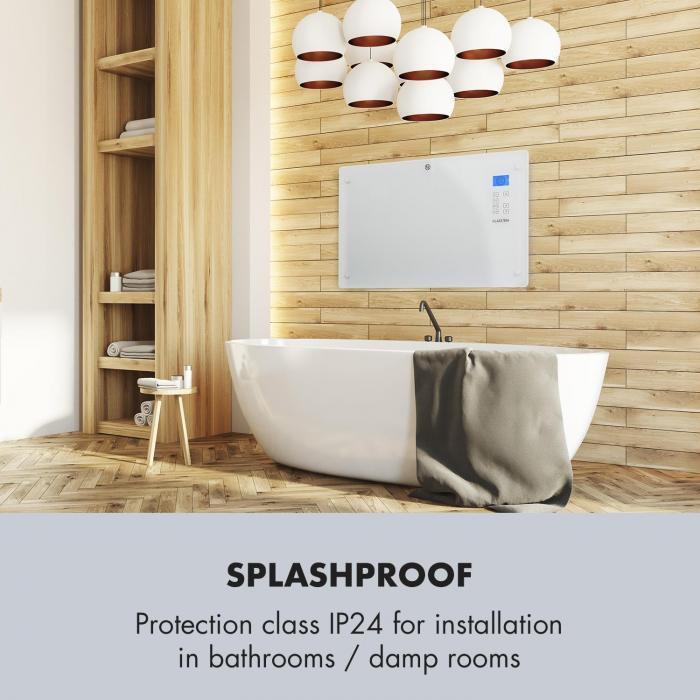 Všetky nastavenia možno realizovať priamo na dotykovom paneli zariadenia. Integrovaný LCD displej prehľadne poskytuje informácie o vybraných funkciách a zobrazuje teplotu v miestnosti. Elegantný biely predný panel vyrobený z 5 mm hrubého skla dodá každej miestnosti luxusný nádych.