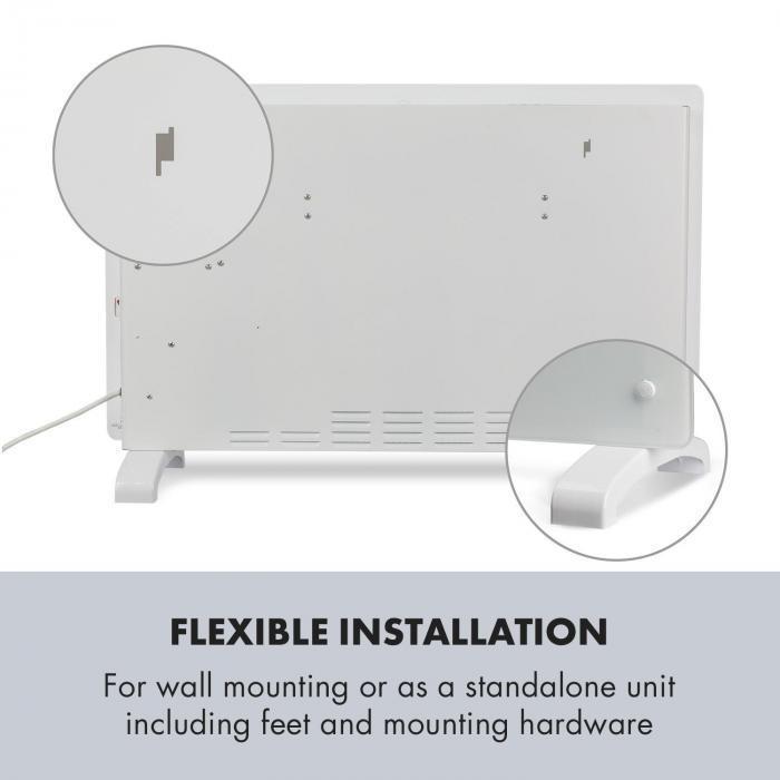 Prostredníctvom dvoch vykurovacích úrovní ohrieva ohrievač Klarstein s výkonom 2000 W priestory podľa želania na 15 až 35 °C. Vykurovacie teleso z ušľachtilej ocele má okrem toho mnoho výhod: vyznačuje sa rýchlym a predovšetkým nepáchnucím teplom a tiež dlhou životnosťou. Vďaka snímaču teploty termostat udržiava požadovanú teplotu na stupeň presne. Detektor mrazu chráni priestory pred podchladením a poškodením mrazom tým, že nedovolí teplote klesnúť pod 5 °C. To nie je všetko, senzor tiež rozpozná, ak sú v miestnosti otvorené okná a vypne zariadenie. Ochrana pred prehriatím a mimoriadne úsporný režim Eco sú tiež zahrnuté v rozsahu funkcií. Pri použití časovača sa konvekčný ohrievač zapne a vypne na minútu presne podľa nastavení a možno ho naprogramovať na celý týždeň. Vďaka ochrane proti striekajúcej vode IP24 je zariadenie Norderney možné umiestniť aj vo vlhkých miestnostiach, ako sú kuchyňa alebo kúpeľňa. Flexibilná je aj inštalácia, ktorá je možná buď vo forme stojaceho zariadenia, alebo nástenná montáž - príslušný montážny materiál, resp. nožičky sú súčasťou dodávky.