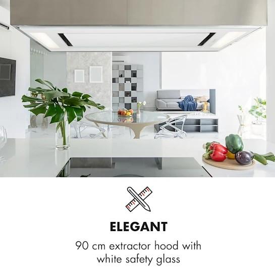 - Elegantný: 90 cm digestor s bielym bezpečnostným sklom