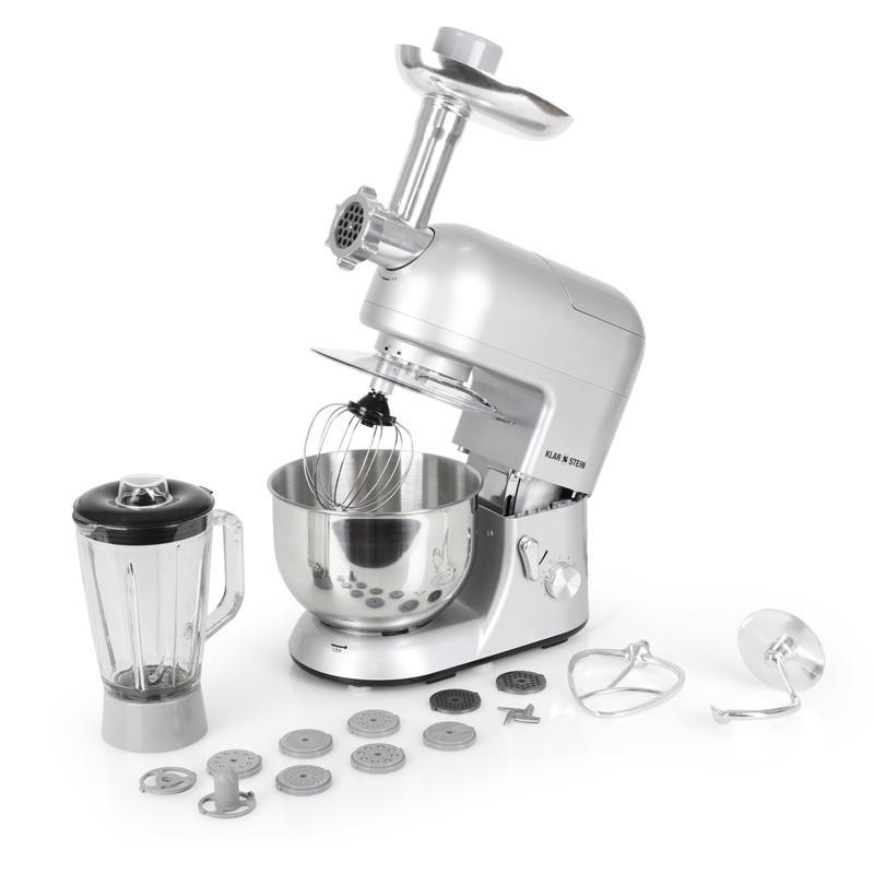 Klarstein Lucia Argentea je silný kuchynský robot , ktorý má nástavce na miešanie, hnetenie, mlynček na mäso a mixovací pohár.