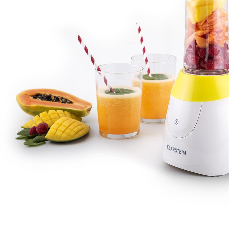 Kompaktný stolný mixér s výkonom 300 W, 4 čepeľami z nerezovej ocele a tiež so zapínačom a vypínačom s pulznou funkciou pre prípravu smoothies, polievok a bylinkových zmesí. Tritanová mixovacia fľaša s objemom 0,6 litra a s vekom pre voliteľné použitie ako nádoba na pitie. Tritanový šejker s objemom 0,8 litra pre voliteľné použitie ako odmerka. Zariadenie Paradise City od spoločnosti Klarstein je kompaktný, ale výkonný stolný mixér, ktorý sa venuje príprave zdravých ovocných a zeleninových kokteilov, chutných dresingov a príprave čerstvých byliniek. Pre raňajky, bohaté na vitamíny, s lahodným smoothie veľa nepotrebuje. Stačí si vybrať Vašej obľúbené ovocie a dať ho priamo do multifunkčnej mixovacej fľaše s objemom 0,6 litra. Krátko mixujte, nasaďte veko a vitálny štart dňa sa môže začať. Aby ste si hneď mohli pochutnať, dá sa fľaša v okamihu zmeniť priskrutkovaním veka na prenosnú fľašu na pitie. Alebo to má byť blahodarná polievka? Žiaden problém. Potrebujete iba trochu zeleniny, štipku korenia a 0,8-litrový mixovací pohár s odmerkou. Potom ešte priliať horúcu vodu a hotovo. Dokonca sa Vám v krátkom čase podaria vlastné zmesi byliniek a čerstvé dresingy. Tento druh prípravy jedla Vám zaručuje prírodný, nefalšovaný chuťový zážitok bez akýchkoľvek prísad. Svoju výkonnosť zabezpečuje mixér Klarstein s ostrým 4-čepeľovým nožom z nerezovej ocele a s silným motorom s výkonom 300 W. Obsluha a čistenie idú rovnako jednoducho a od ruky. Zariadenie sa naštartuje výhradne s vloženou čepeľou a pri zapnutí spínača. Pulzná funkcia spínača je ideálna pre jemné, dôsledné rozsekanie. Veľkou výhodou pri čistení je rozkladacia konštrukcia, vďaka ktorej sa rozdelí zariadenie Klarstein Paradise City na nástavec s nožmi a mixovaciu nádobu. Ľahko čistiteľnú nádoba z tritanu bez BPA jednoducho vložte do umývačky, zatiaľ čo čepeľ by mala byť pri veľkom znečistení namočená. Spravidla však postačí hubka, čistiaci prostriedok a čistá voda. Základňu zariadenia stačí pretrieť utierkou alebo handričkou. Aby zariadenie slúžilo dobre aj pri plnom výkone, mixér Klarstein Paradise City stojí na troch protišmykových nožičkách, zabezpečených proti prevráteniu.