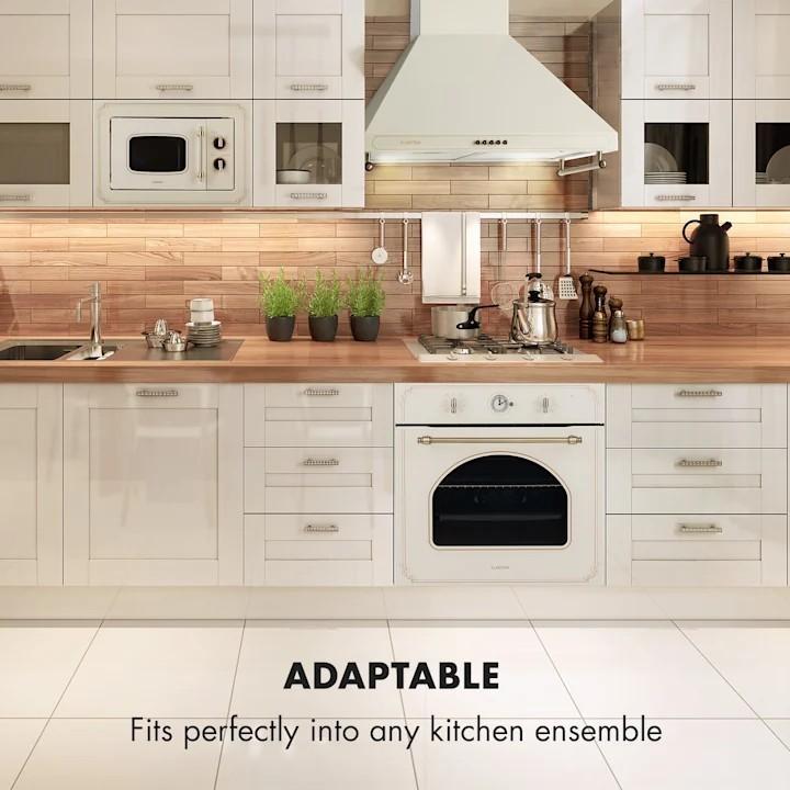 Vstavaná mikrovlnná rúra Klarstein Victoria 20 vrátane montážneho rámu je výkonné, všestranné zariadenie pre jednotlivcov aj väčšie domácnosti, zjednocuje v jednom multifunkčnom zariadení mikrovlnnú rúru a gril. Výkon mikrovlnnej rúry 800 W a 20-litrový varný priestor perfektne prispôsobujú zariadenie potrebám našej rýchlej doby: V 5 úrovniach je možné ručne pohodlne nastaviť výkon, aby sa v čo najkratšom čase hotové jedlo ohrialo, uvarilo alebo udržalo teplé. Pre dosiahnutie optimálnych výsledkov na sklenenom tanieri s priemerom 24,5 cm sa optimálne reguluje aj čas varenia v priebehu niekoľkých sekúnd. Keď uplynie daný čas, vstavaná mikrovlnná rúra sa zastaví a upozorní na koniec pípnutím. Na takto pripravené jedlá teda nezabudnete a rýchlo sa môžete najesť. Okrem toho má zariadenie Victoria 20 horúci 1000 W gril, ktorý vo veľmi krátkom čase opečie vďaka dodávanej grilovacej mriežke klobásky aj mäso: jednoducho zapnite funkciu alebo zvoľte pomocou funkcie QuickSelect požadovanú kombináciu teplôt grilu a mikrovlnky a pečenie môže začať! Vstavaná mikrovlnná rúra Klarstein ponúka okrem toho funkciu rozmrazovania na rozmrazenie mrazených potravín, vďaka ktorej bude hračka rozmrazovať mäso, hydinu alebo morské plody bez toho, aby ste ich nechtiac rozvarili. Vnútorná časť zariadenia má interiér z ušľachtilej ocele SimpleClean, ktorý je mimoriadne odolný a ľahko sa čistí. Z vonkajšej strany má vstavaná mikrovlnná rúra Victoria 20 už podľa názvu elegantnú úpravu, ktorá pripomína retro dizajn 19. storočia a ktorý bez pochýb zapadne do každého moderného aj klasického kuchynského prostredia.