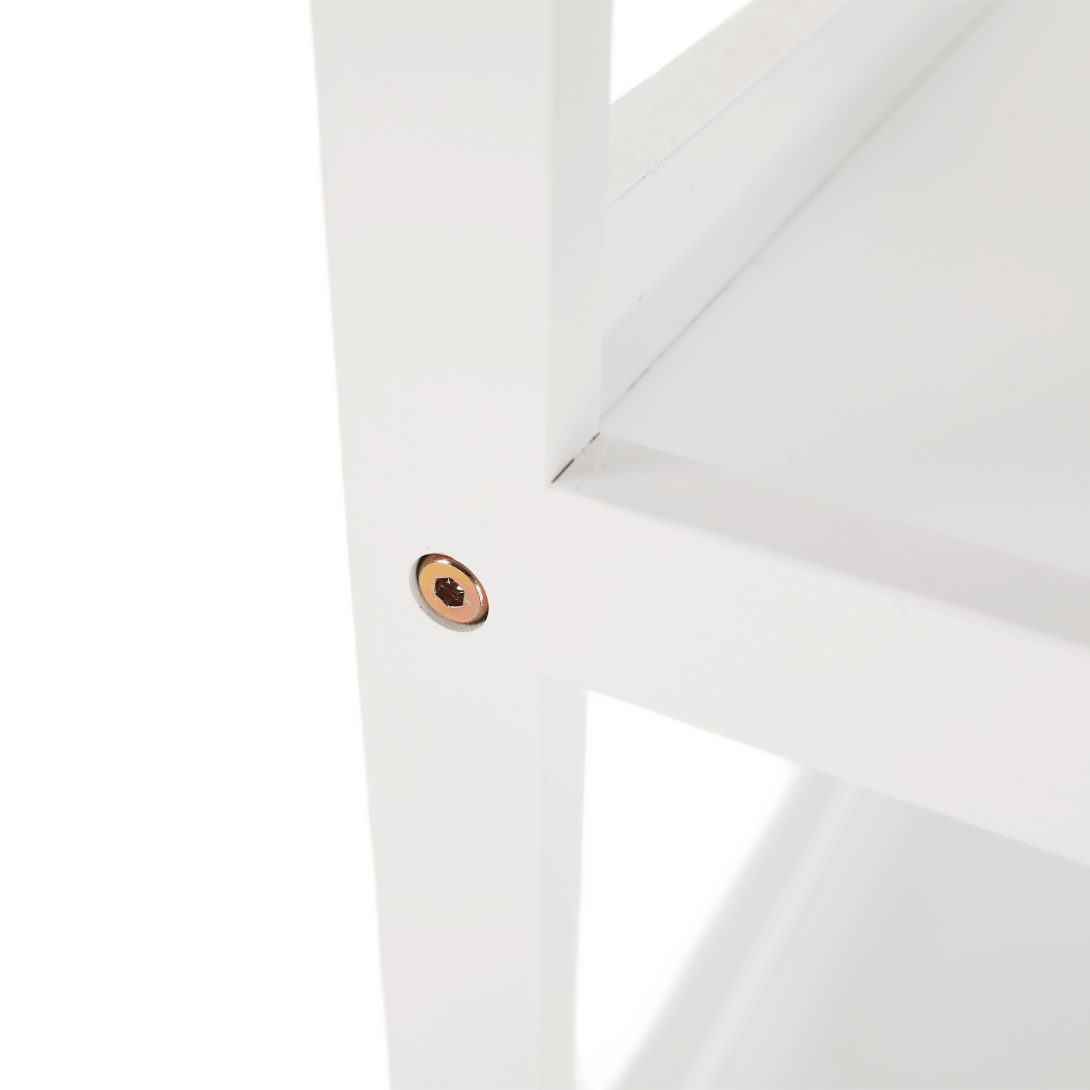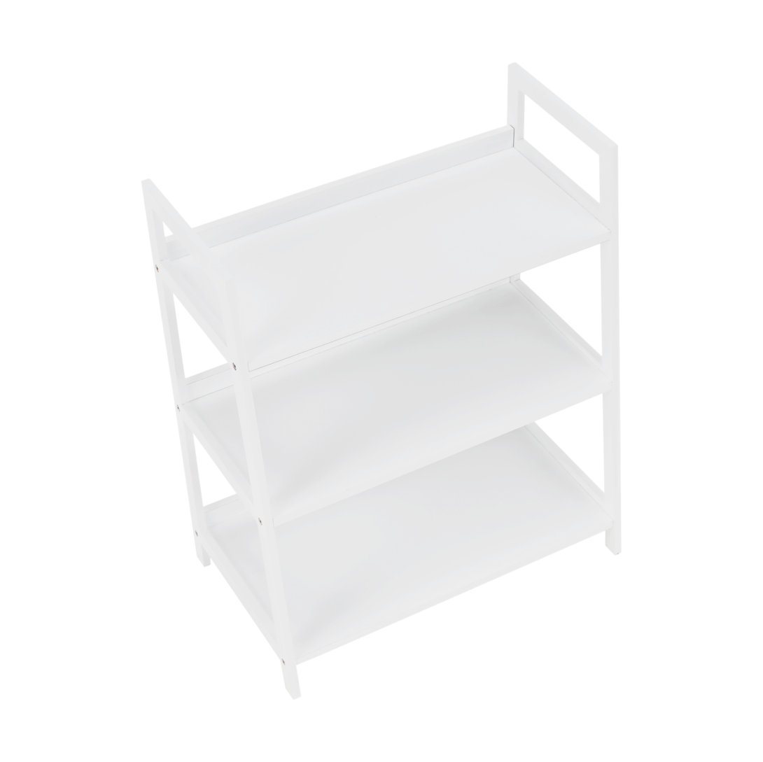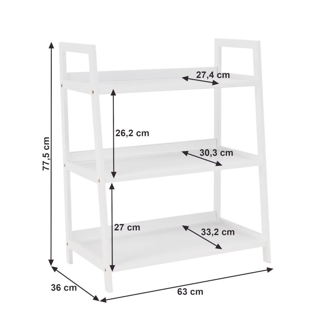 Viacúčelový regál REONMateriál: MDF/bambus lakovanýFarba: bielaRozmery (ŠxHxV): 63x36x77,5 cmHrúbka materiálu stojan: 1,4 cmHrúbka materiálu polica: 1,6 cmNosnosť na jednu policu: 5 kg3 policeHĺbka vrchnej police: 27,4 cmHĺbka strednej police: 30,3 cmHĺbka spodnej police: 33,2 cmPriestor medzi vrchnou a strednou policou: 26,2 cmPriestor medzi strednou a spodnou policou: 27 cmModerný dizajnPraktickýDodávané v demonte.