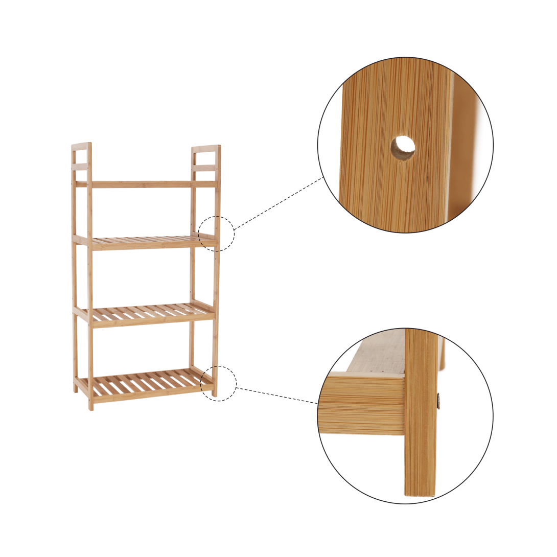 Materiál: bambus lakovanýFarba: prírodný bambusRozmery (ŠxHxV): 53x26x100 cm4-policovýVýškovo nastaviteľné policeViacúčelovýModernýPraktickýNosnosť:40 kgDodávané v demonte