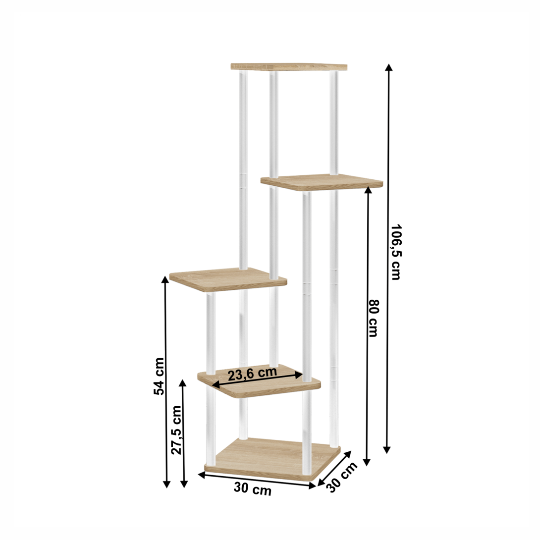 Materiál: kov/drevotrieskaFarba: biela/dub sonomaRozmery (ŠxHxV): 30x30x106,5 cmAko stojan na črepníkové rastliny5 polícNosnosť na policu: 5 kgHrúbka tyče: 1,6 cmVýška medzi 1 a 2 policou: 27,5 cmVýška medzi 1 a 3 policou: 54 cmVýška medzi 1a 4 policou: 80 cmKovová konštrukciaModerný štýlDodávané v demonte