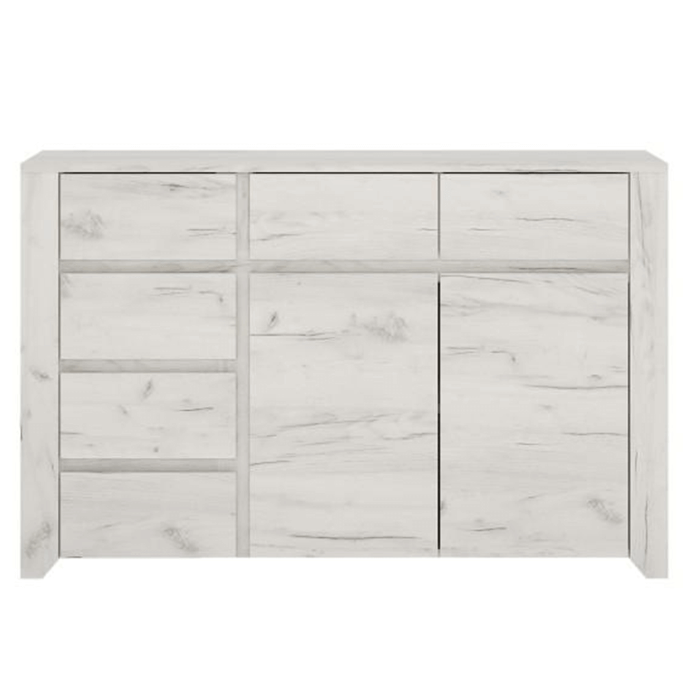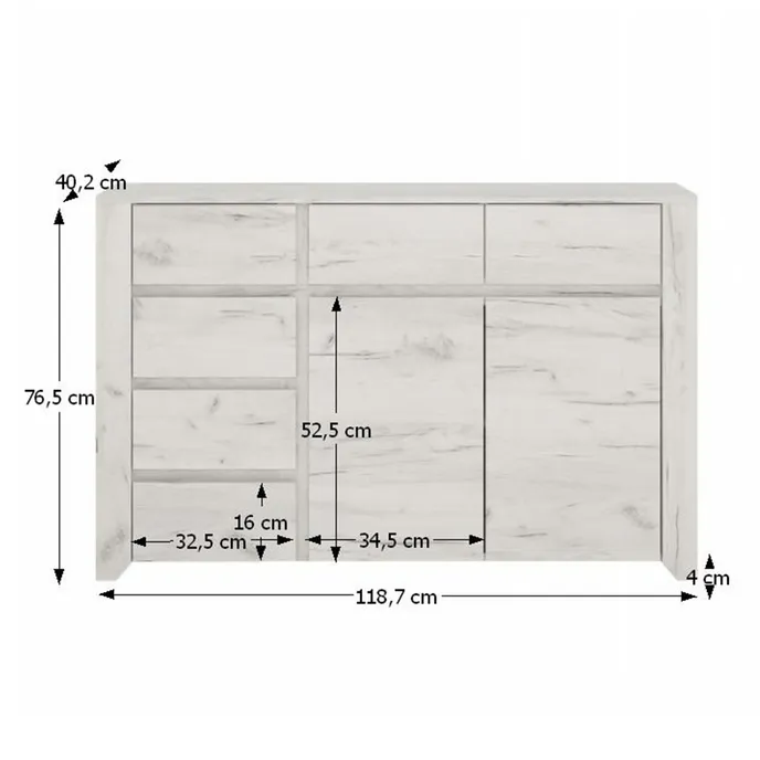 Komoda TYP 42 zo sektorovej zostavy ANGEL so skrinkou, dvoma menšími a štyrmi väčšími šuplíkmiMateriál: laminovaná DTD Farba: biela craft Rozmery (ŠxHxV): 118,7x40,2x76,5 cm Výška spodného priestoru od podlahy: 2,5 cmHrúbka materiálu: 16 mmDodávané v demonte