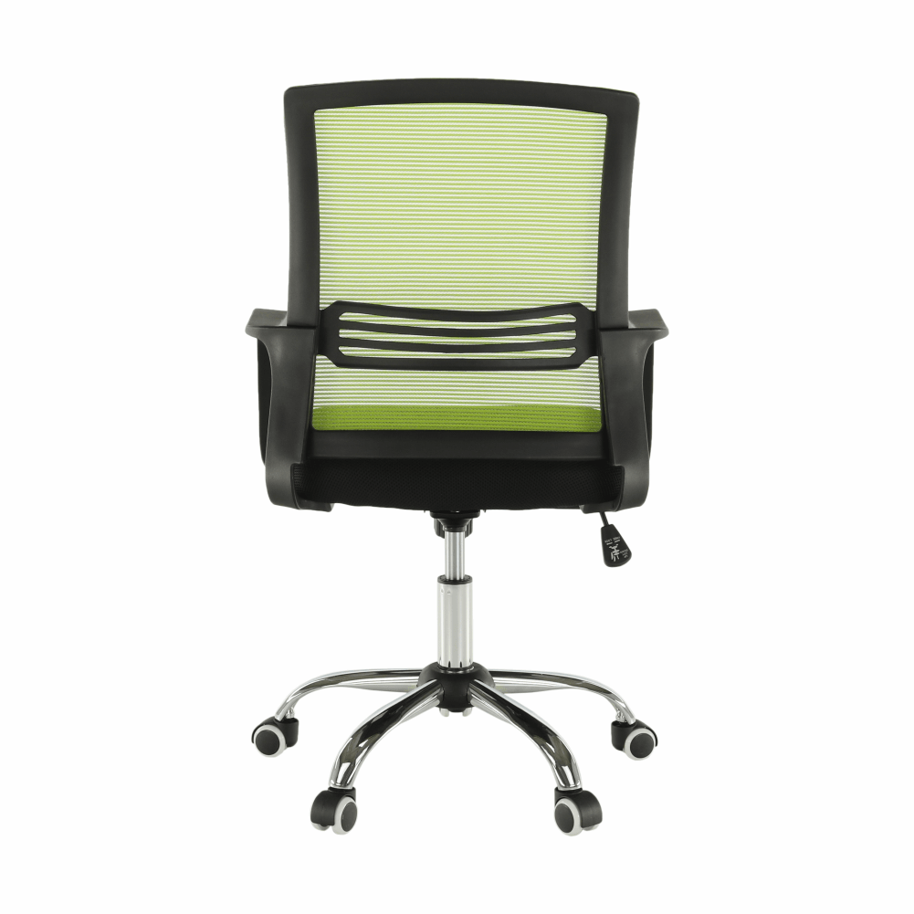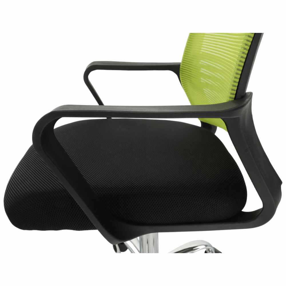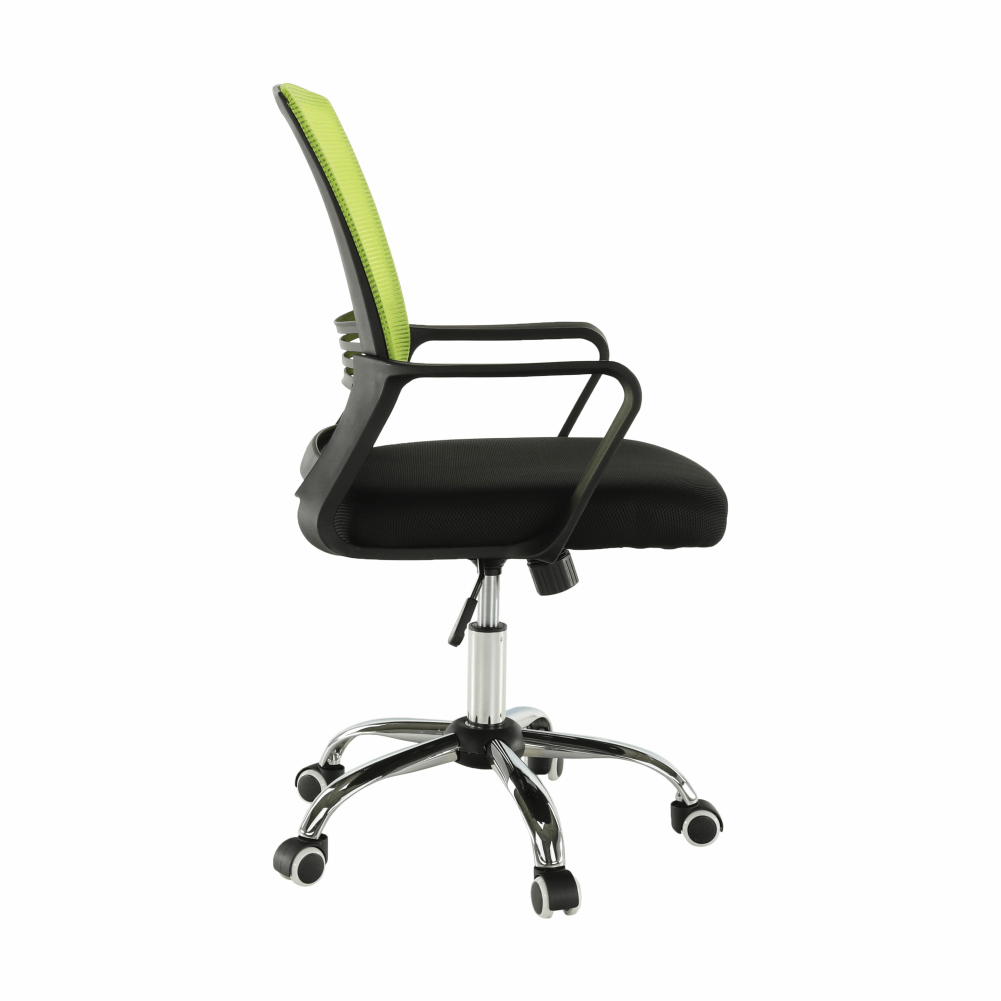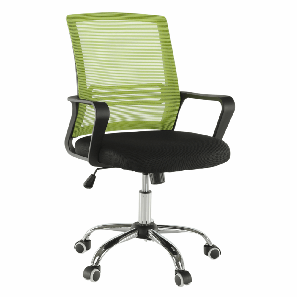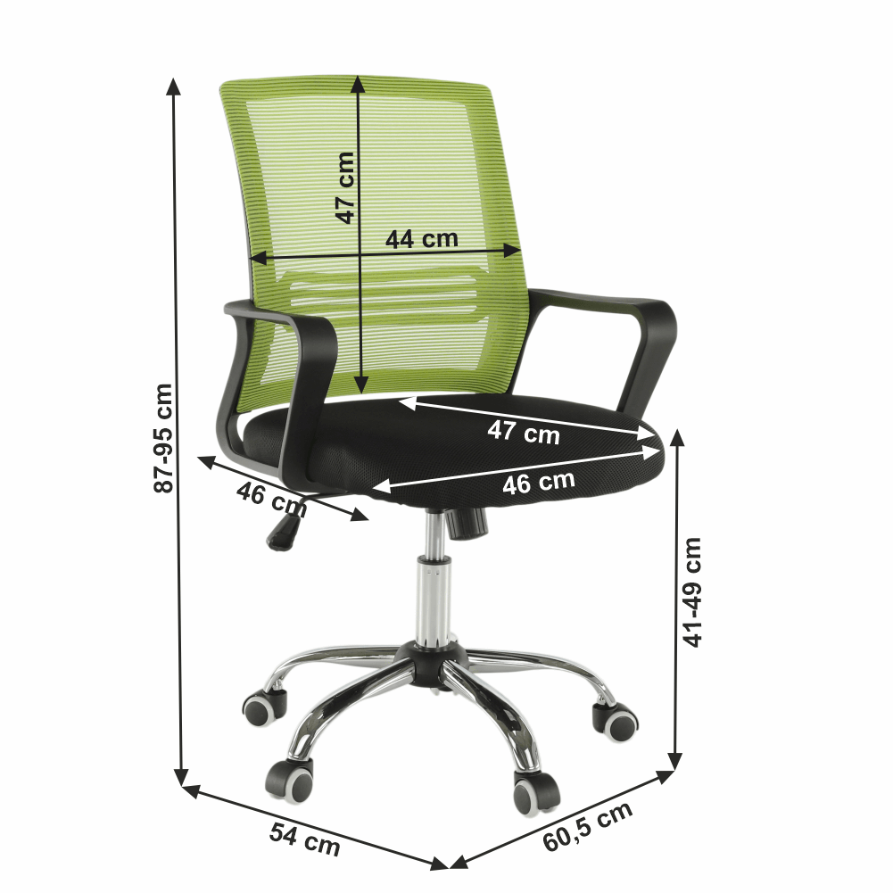 Kancelárske kreslo, materiál: sieťovina/plast/kovOderuodolnosť textílie podľa testu Martindale: 90 000 oderovfarba: zelená/čierna/chrómUniverzálne kolieska vhodné na mäkké aj tvrdé podlahypodlahy, rozmery (ŠxHxV): 60,5x54x87-95 cm,výška sedu: 41-49 cm.Nosnosť: 100 kgDodávané v demonte