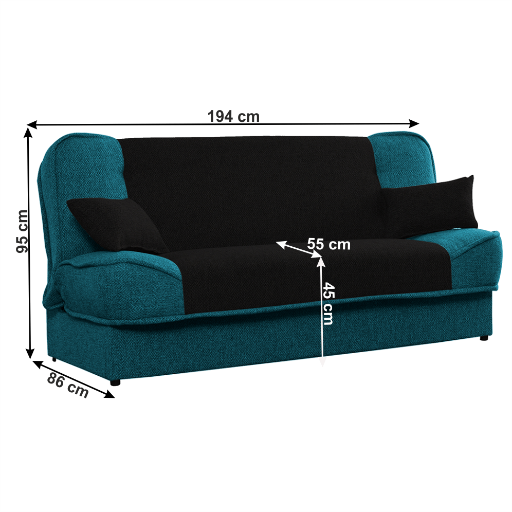 Materiál: látka PortlandOderuodolnosť textílie podľa testu Martindale: 52 000 oderovFarba: 85 tyrkysová/100 čiernaRozmery (ŠxHxV): 194x86x95 cm Plocha na spanie (ŠxD): 194x120 cmNosnosť na osobu: 90 kgVýška sedu: 45 cmHĺbka sedu: 55 cmVýška spodného priestoru od podlahy: 2 cmDva dekoratívne vankúšeÚložný priestor.Dodávané v demonte.