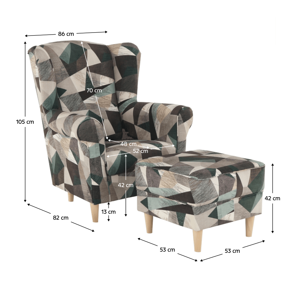 Pohodlné kreslo - ušiak s taburetom, prevedenie: Holm látka hnedozelená vzor- nožičky drevené. Oderuodolnosť textílie podľa testu Martindale: 90 000 oderov rozmery (ŠxVxH): kreslo - 86x105x82 cm, taburet - 53x42x53 cm, Výška spodného priestoru od podlahy: 13 cm Nosnosť kresla: 120 kg Nosnosť taburetu: 90 kg Dodávané v demonte. Možnosť objednania v 6 farebných prevedeniach látky alova v cene 319 eur alebo látky Soro v cene 339 Eur. Pri individuálnej objednávke je potrebné zaplatiť 10% zálohu z danej sumy. Po uhradení zálohy bude Vaša požiadavka zadaná do výroby. Dodacia lehota 6-8 týždňov.