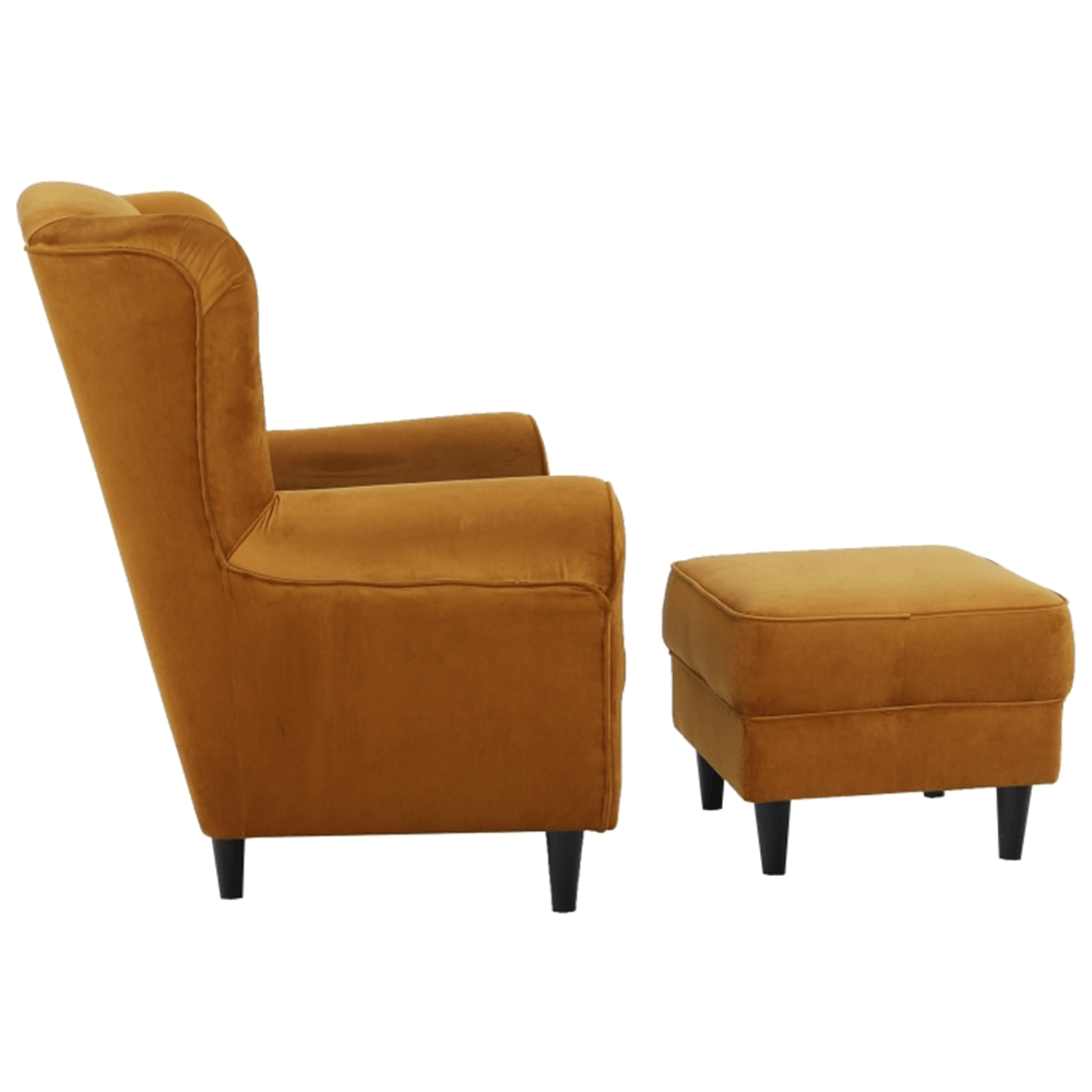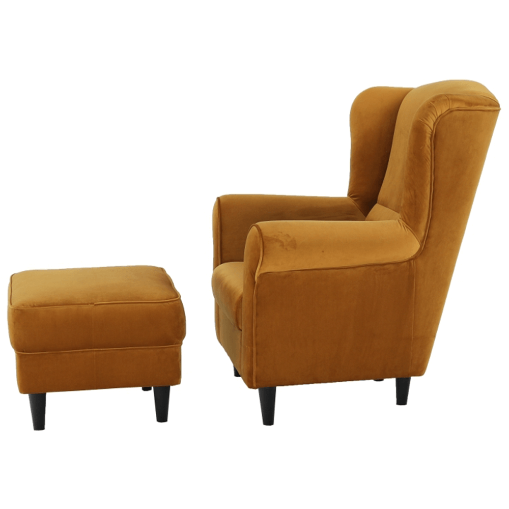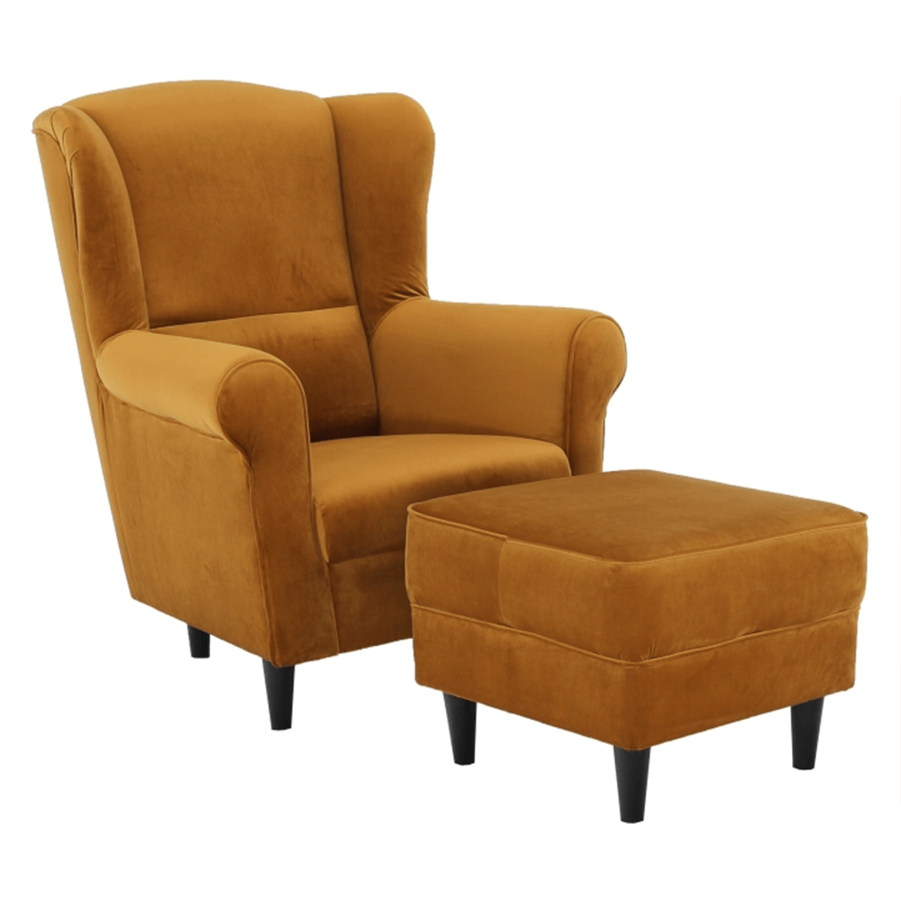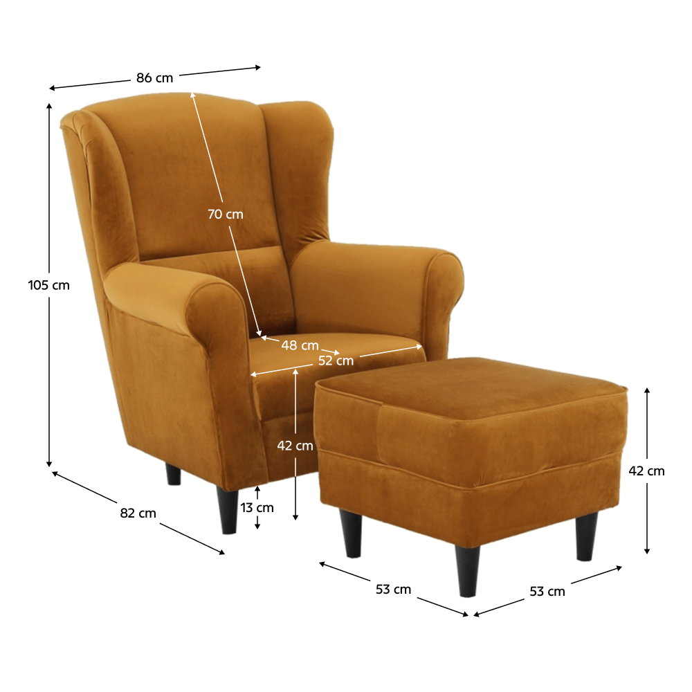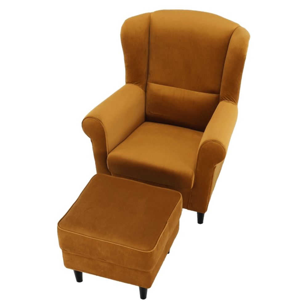 Pohodlné kreslo - ušiak s taburetom, prevedenie: Riviera látka horčicová - nožičky drevené. Oderuodolnosť textílie podľa testu Martindale: 90 000 oderov rozmery (ŠxVxH): kreslo - 86x105x82 cm, taburet - 53x42x53 cm, Výška spodného priestoru od podlahy: 13 cm Nosnosť kresla: 120 kg Nosnosť taburetu: 90 kg Dodávané v demonte. Možnosť objednania v 6 farebných prevedeniach látky alova v cene 319 eur alebo látky Soro v cene 339 Eur. Pri individuálnej objednávke je potrebné zaplatiť 10% zálohu z danej sumy. Po uhradení zálohy bude Vaša požiadavka zadaná do výroby. Dodacia lehota 6-8 týždňov.