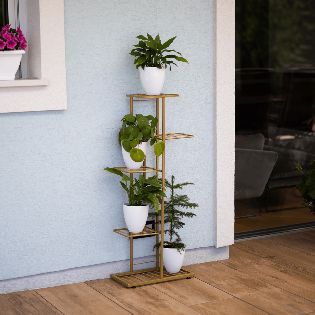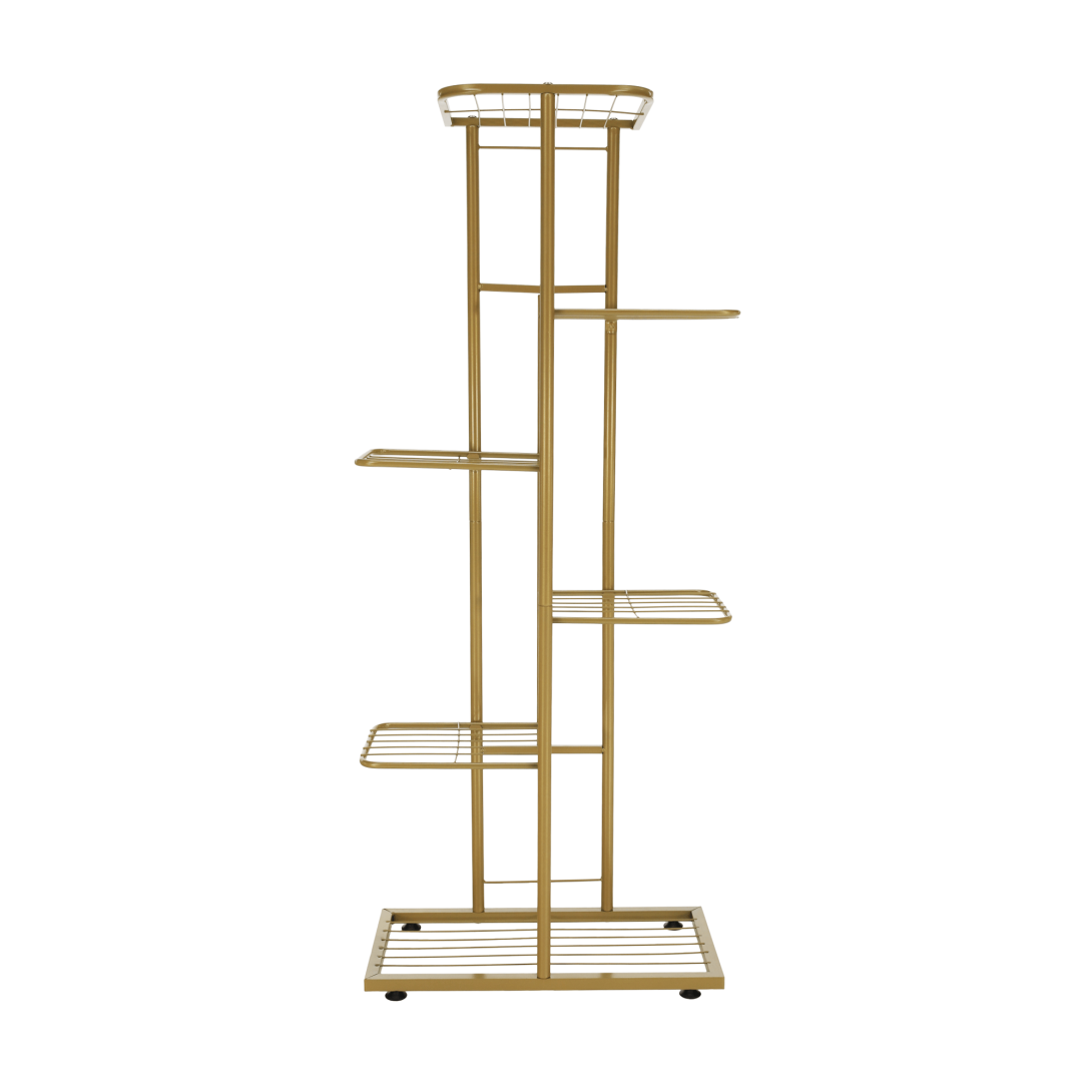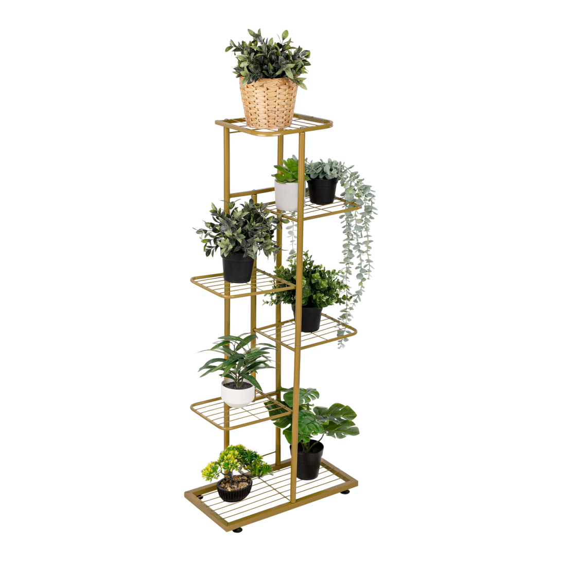 Materiál: kovFarba: zlatáRozmery (ŠxHxV): 43,5x22x108 cmNosnosť na jednu policu: 2 kgHrúbka tyče: 1,6 cmVýška spodnej police z pravej strany: 26 cmVýška druhej police z pravej strany: 34,5 cmVýška prvej police z ľavej strany: 43,5 cmVýška druhej police z ľavej strany: 34,5 cmVýška tretej police: 22,5 cmVýška nožičiek: 1 cmKovová konštrukcia6 polícModerný štýlAko stojan na črepníkové rastlinyNohy zakončené ohybnými klzákmi na vyrovnanie nerovnosti povrchuDodávané v demonte