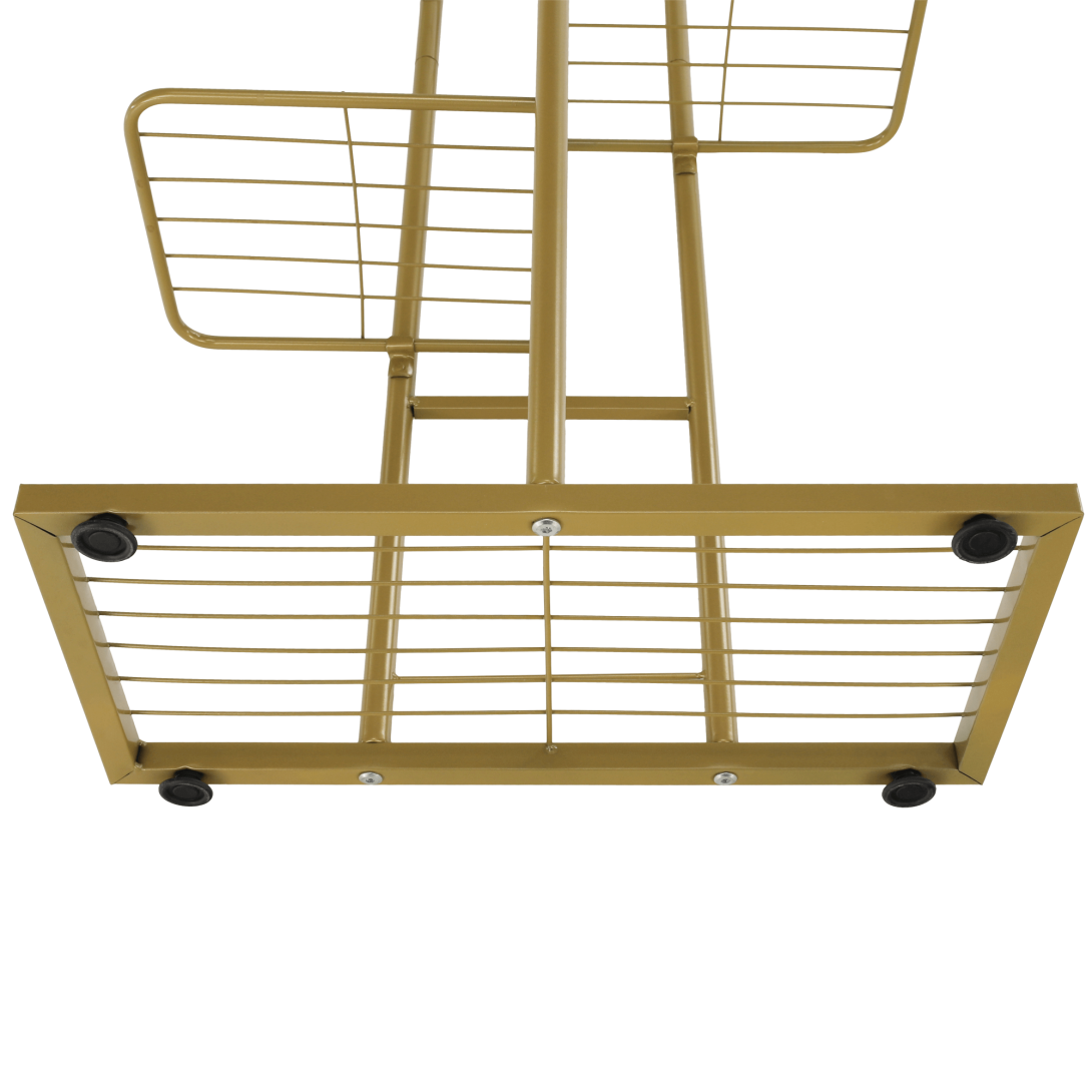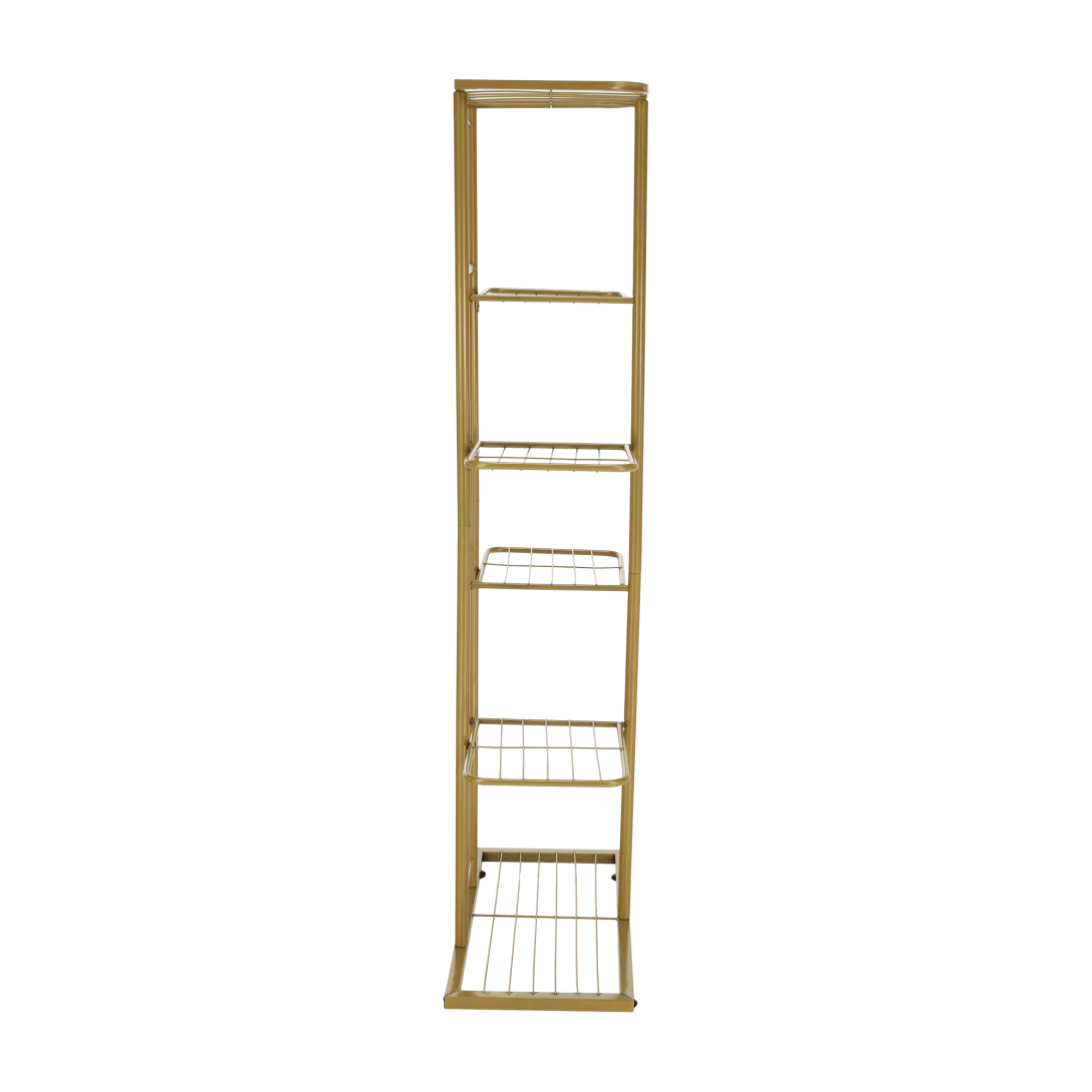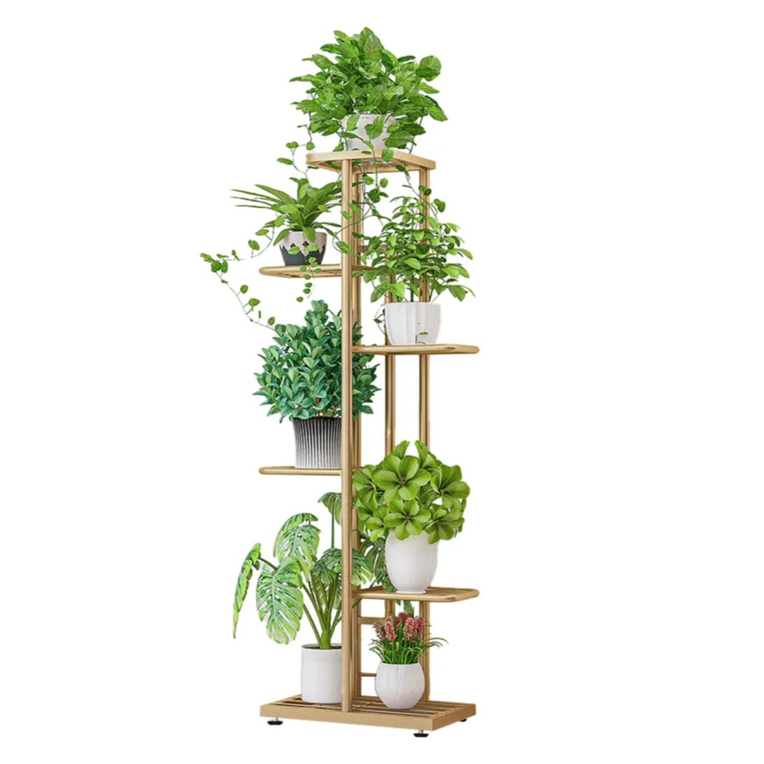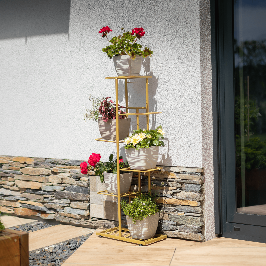 Materiál: kovFarba: zlatáRozmery (ŠxHxV): 43,5x22x108 cmNosnosť na jednu policu: 2 kgHrúbka tyče: 1,6 cmVýška spodnej police z pravej strany: 26 cmVýška druhej police z pravej strany: 34,5 cmVýška prvej police z ľavej strany: 43,5 cmVýška druhej police z ľavej strany: 34,5 cmVýška tretej police: 22,5 cmVýška nožičiek: 1 cmKovová konštrukcia6 polícModerný štýlAko stojan na črepníkové rastlinyNohy zakončené ohybnými klzákmi na vyrovnanie nerovnosti povrchuDodávané v demonte