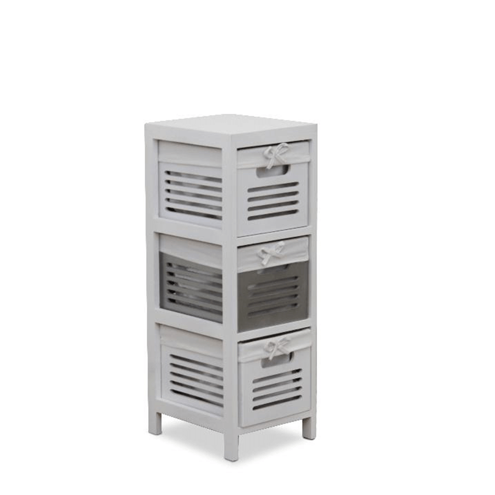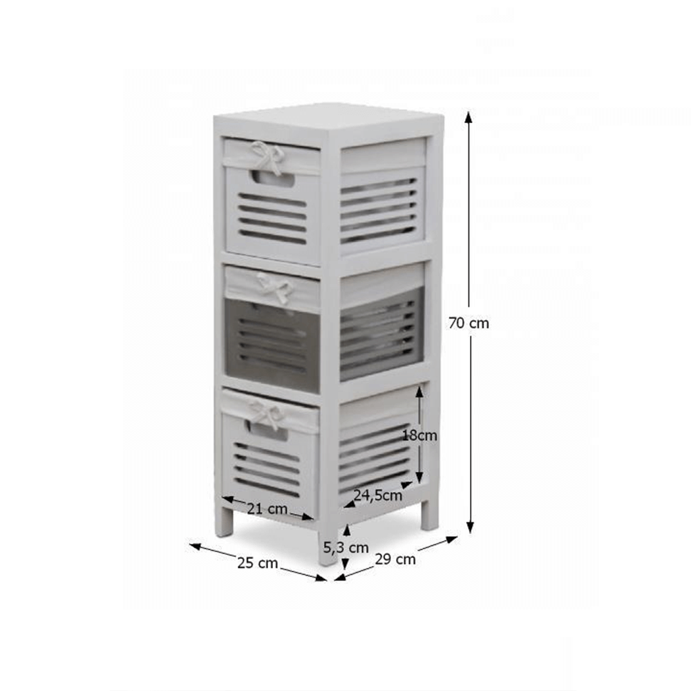 3 šuplíková biela komoda s pevným rámom,Materiál: drevoFarba: biela/siváRozmery (ŠxHxV): 25x29x70 cmHmotnosť: 5,7 kgDodávané v monte.