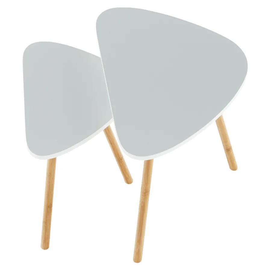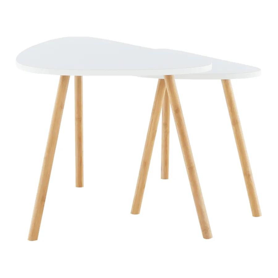 Hľadáte praktický a dizajnový stolík vhodný do vašej obývačky? A čo tak rovno dva stolíky? Predstavujeme vám atraktívnu sadu konferenčných stolíkov BISMAK, ktoré vytvoria vo vašej domácnosti príjemnú a útulnú atmosféru. Korpus stola je vyrobený z MDF v bielej farbe, nohy sú z prírodného lakovaného bambusu. Využite bohatú odkladaciu plochu, a odložte si naň nedočítané noviny, koláčiky pre hostí, šálku kávy alebo nohy po dlhom únavnom dni. Tiež poslúži ako podstavec na kvetináč s izbovými rastlinami.