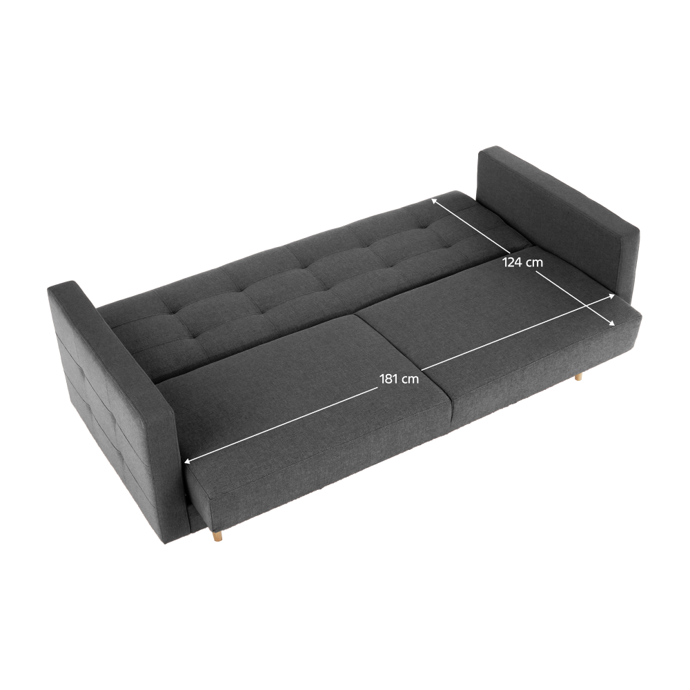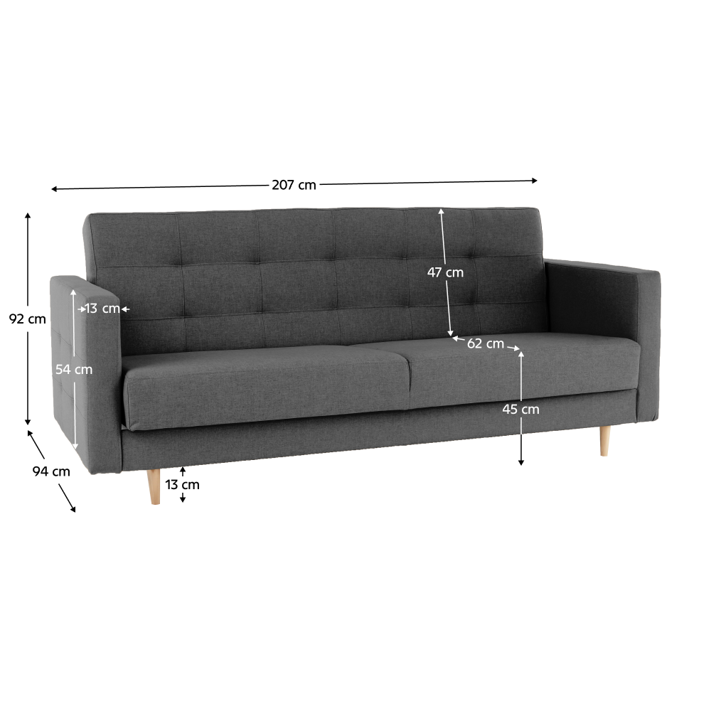 Materiál čalúnenie: látka NORNOderuodolnosť textílie podľa testu Martindale: 50 000 oderovFarba: 15 tmavosiváMateriál nohy: drevoFarba: naturalRozmery (ŠxHxV): 207x94x92 cmRozkladaciaPlocha na spanie (ŠxD): 124x181 cmHĺbka sedu: 62 cmVýška sedu: 45 cmVýška spodného priestoru od podlahy: 13 cmNosnosť na osobu: 90 kgVýška chrbtovej opierky: 47 cmRozmery opierky na ruky (ŠxV): 13x54 cmS úložným priestoromVýplň sedacej časti bonelová pružinaDekoratívne prešitieNa nožičkáchŠkandinávsky štýlMožnosť zakúpiť si kreslo v rovnakom prevedeníDodávaná v demonte