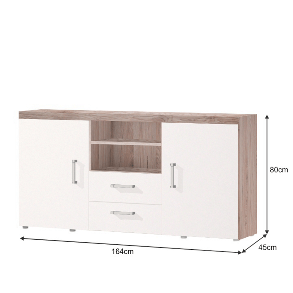 Materiál: DTD laminovanáFarba: san marino/creamRozmery (ŠxHxV): 165x45x80 cmHrúbka materiálu: 16 mm 2 skrinkyOtvorený úložný priestor2 šuplíkyDodávané v demonte