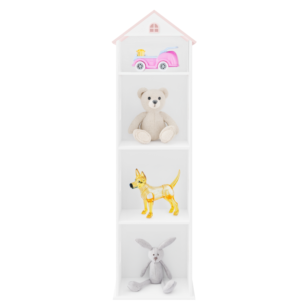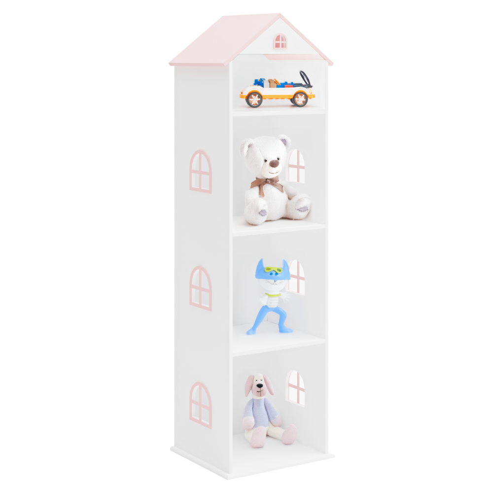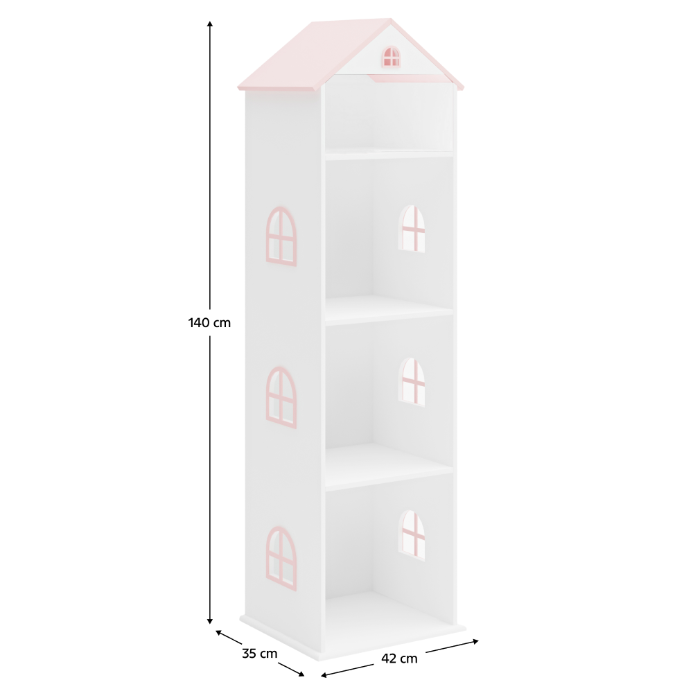 Materiál: MDFFarba: biela/ružováRozmery (ŠxHxV): 40x35x140 cmHrúbka materiálu: 1,2 cmNosnosť police: 10 kgDetská knižnicaRegálV tvare domčekaHravý dizajnPodporuje detskú fantáziuOtvorený úložný priestorPolicePraktickýVhodný na uskladnenie kníh, hračiek alebo iných drobnostíVhodné do detských iziebNevhodné pre deti do 3 rokovSpĺňa bezpečnostné normy EN 71Odporúčame pripevniť k steneDodávané v demonte