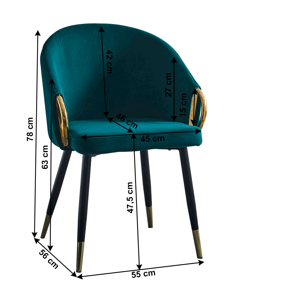 Materiál: velvet látka/čierny kov/chrómOderuodolnosť textílie podľa testu Martindale: 85 000 oderovFarba: smaragdová/čierna/gold chróm zlatýRozmery (ŠxHxV): 55x56x78 cmHĺbka sedenia: 46 cmVýška sedenia: 47,5 cmVýška opierky chrbta: 42 cmŠírka sedadla: 45 cmVýška opierky rúk: 27 cmVýška zlatej časti opierky: 15 cmVýška od zeme po opierku: 63 cmNosnosť: 90 kgDizajnové, luxusnéPríručnéElegantné a funkčnéKovová konštrukciaNohy zakončené ohybnými klzákmi na vyrovnanie nerovnosti povrchuDodávané v demonte