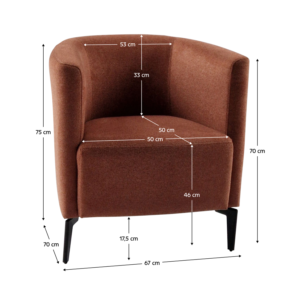 Materiál: látka Matana 07Oderuodolnosť látky podľa testu Martindale: 57 000 oderovRozmery (ŠxHxV): 67x70x75 cmFarba čalúnenia: terakotaVýplň: pružina falista+ PUR pena T30Materiál nohy: kovFarba nohy: čiernaVýška spodného priestoru od podlahy: 17,5 cmVýška chrbtovej opierky: 33 cmŠírka chrbtovej opierky: 53 cmVýška sedu: 46 cmHĺbka sedu: 50 cmŠírka sedu: 50 cmVýška opierky na ruky: 70 cmNosnosť: 120 kgDizajnovéCeločalúnenéDodávané v demonteMožnosť objednania v 6 farebných prevedeniach látky Matana v cene 149 Eur. Pri individuálnej objednávke je potrebné zaplatiť 10% zálohu z danej sumy. Po uhradení zálohy bude Vaša požiadavka zadaná do výroby. Doba dodania 6-8 týždňov.