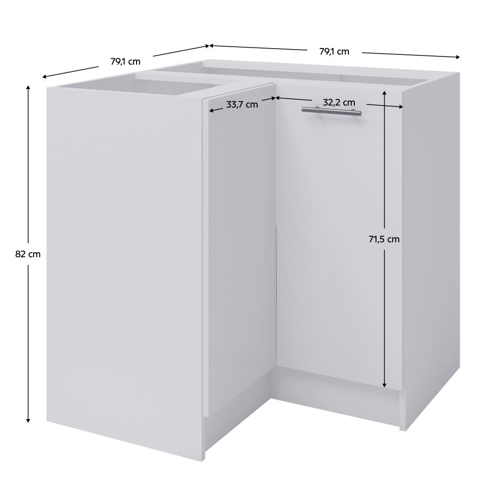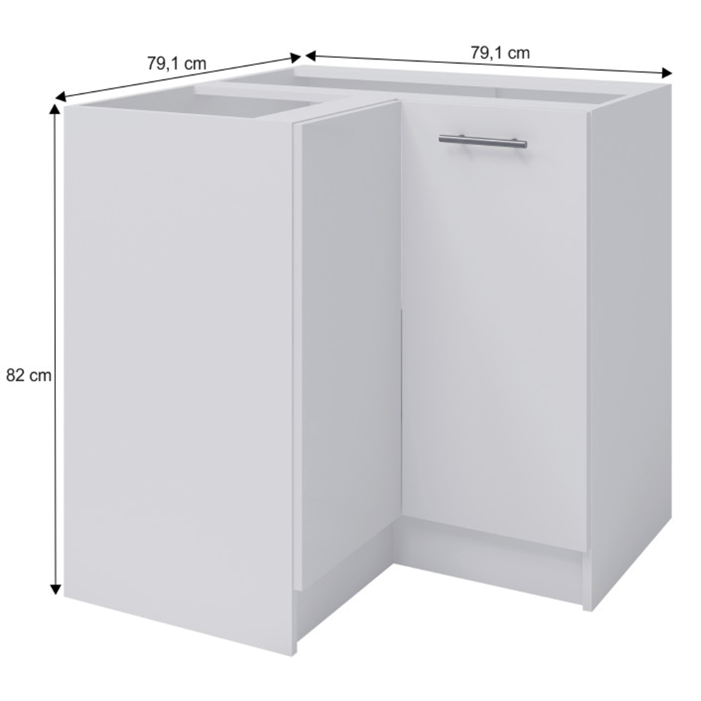 Dolná rohová skrinka S - 90N,Materiál: DTD laminová,Farebné prevedenie: biela, Rozmery ŠxVxH: 79,1x82x79,1 cm.Skrinky základnej zostavy sú dodávané vrátane pracovnej dosky, drezová skrinka je dodávaná bez pracovnej dosky. Sektorové skrinky sú dodávané bez pracovnej dosky.Možnosť zakúpenia pracovnej dosky Fabiana Metalic brown sivá s hrúbkou 2,8 cm,šírkou 60 cm a cenou za bm 49 Eur.Hrúbka materiálu: 16 mm Možnosť dokúpenia univerzálneho Ľ/P drezu LAY ON.Dodávané v demonte.