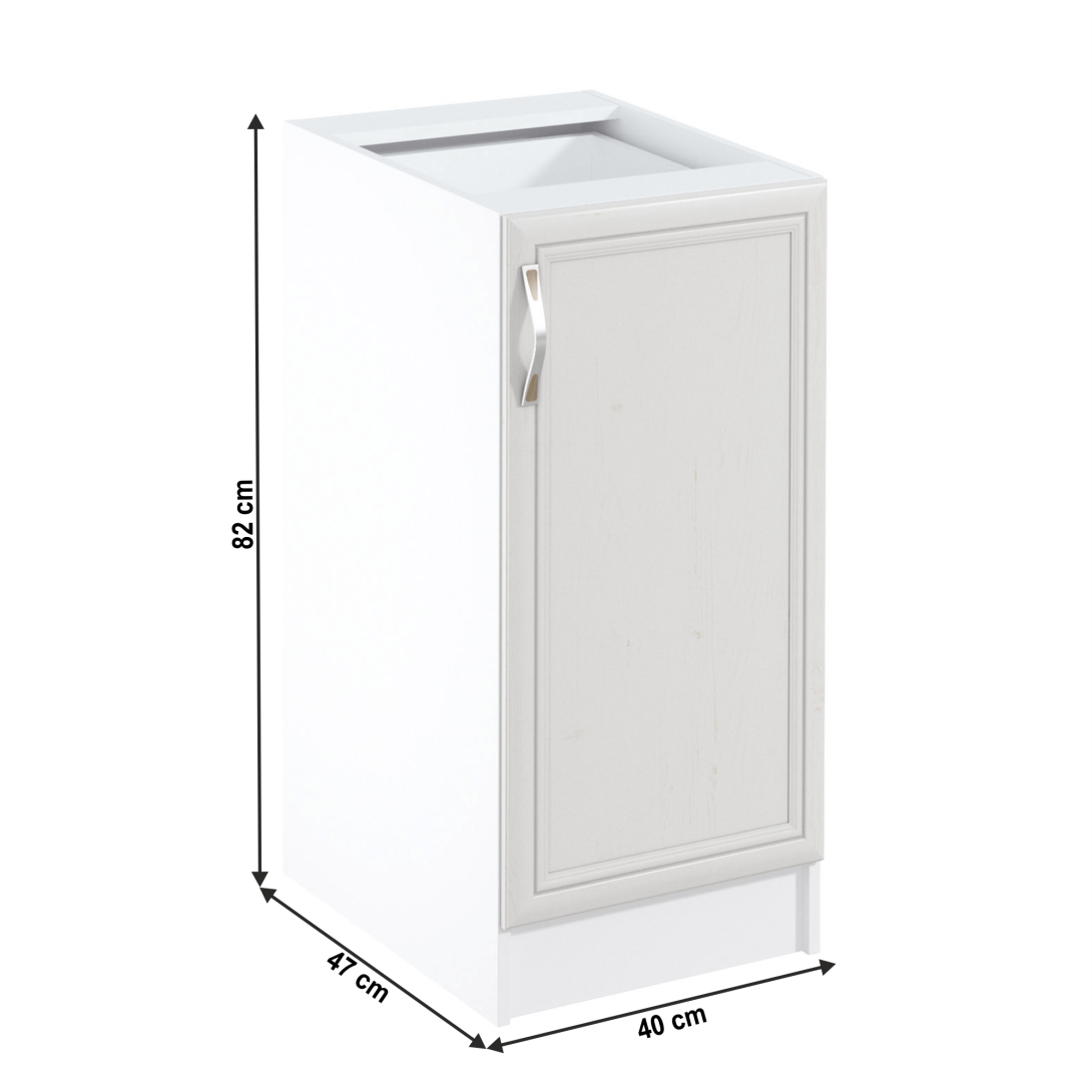 Spodná skrinka D40 s dvierkami, pravá ku kuchyni SICILIAPrevedenie: DTD laminovaná/MDF lištyFarba: biela/sosna AndersenRozmery (ŠxHxV): 40x47x82 cmHrúbka materiálu: 15 mmSpodné skrinky ku kuchyni SICILIA sú dodávané bez pracovnej dosky. Môžete si objednať pracovnú dosku vo farebnom prevedení dub pieskovec v hrúbke 2,8 cm za 49 eur/bm a pracovnú dosku vo farebnom prevedení dub Lancelot v hrúbke 3,8 cm za 56 eur/bm.