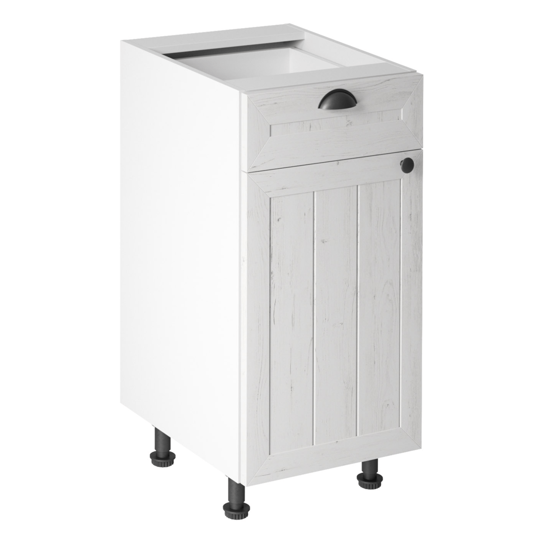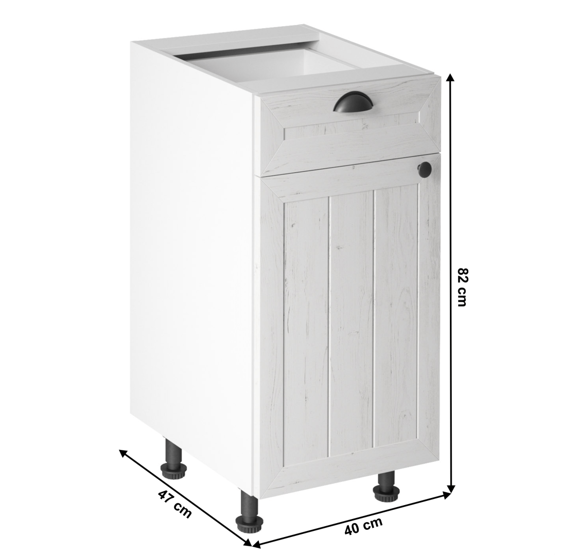 Spodná skrinka s dvierkami a šuplíkom, ku kuchyni PROVANCEPrevedenie: DTD laminovaná/MDFFarba: biela/sosna andersenRozmery (ŠxHxV): 40x47x82 cmHrúbka materiálu: 15 mmSystém tichého zatvárania dvierokCena sektorových skriniek je uvádzaná bez pracovnej dosky a spodnej lišty. Cena za pracovnú dosku dub lancelot je 56 Eur/bm - hrúbka 38 mm, cena za spodnú lištu je 14 Eur. Ku každej dolnej skrinke okrem D25PZ, je potrebné doobjednať 2 ks úchytov na sokel cena 1 Eur/2 ks.