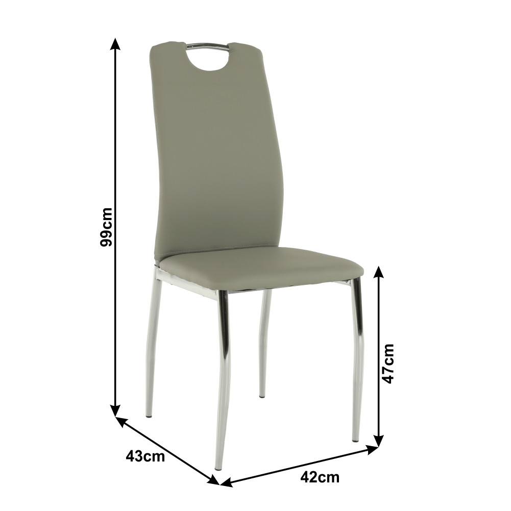 Jedálenská stolička ERVINAMateriál: ekokoža/chrómOderuodolnosť textílie podľa testu Martindale: 100 000 oderovFarba: siváRozmery (ŠxHxV): 42x43x99 cmVýška sedu: 47 cmHĺbka sedu: 40 cmNosnosť: 110 kgDodávané v demonte.