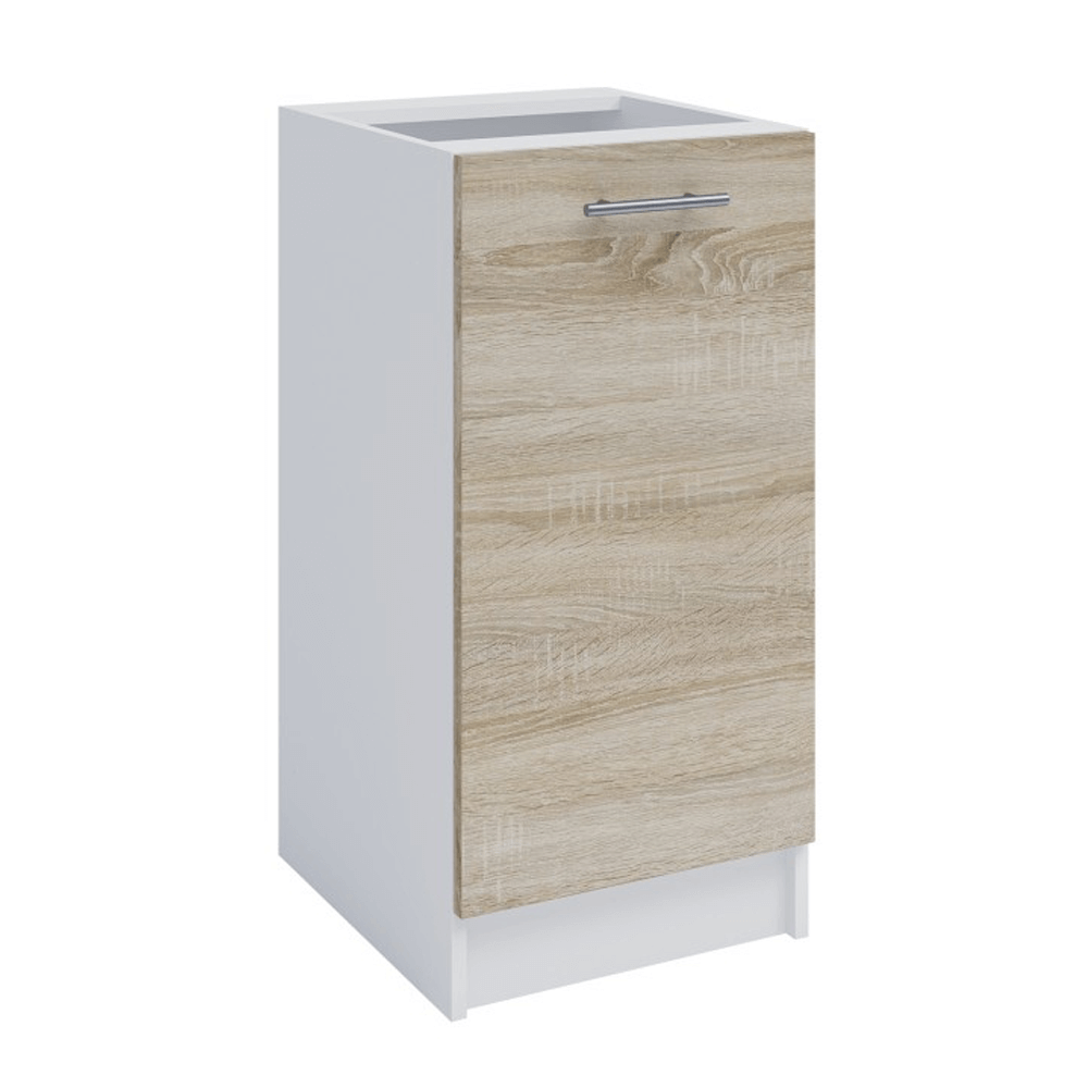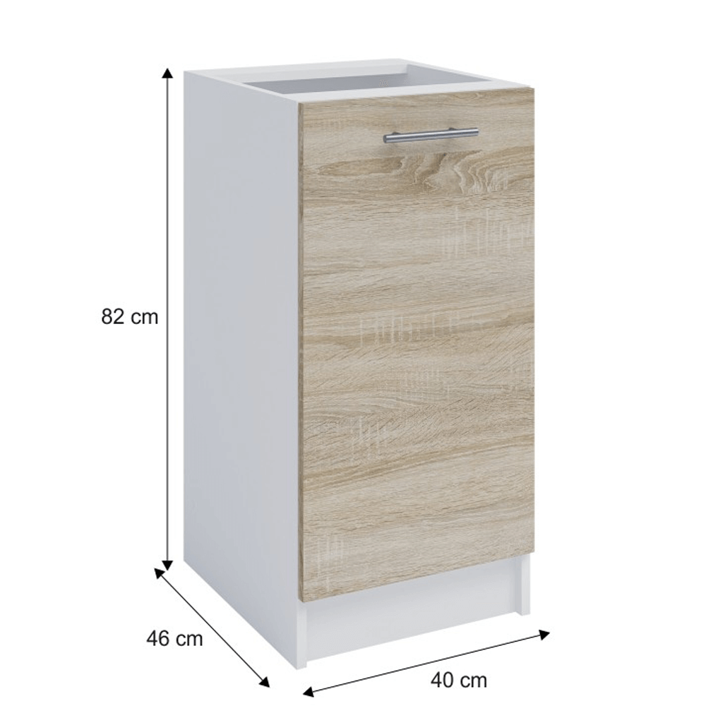 Dolná skrinka S40,Materiál: DTD laminová,Farebné prevedenie: dub sonoma/biela,Korpus: biela, dvierka: dub sonoma.Rozmery ŠxVxH: 40x82x46 cm.Hrúbka materiálu: 16 mm Skrinky základnej zostavy sú dodávané vrátane pracovnej dosky, drezová skrinka je dodávaná bez pracovnej dosky. Sektorové skrinky sú dodávané bez pracovnej dosky.Cena pracovnej dosky je: 1bm: 49 eurMožnosť dokúpenia univerzálneho Ľ/P drezu LAY ONDodávané v demonte.Skrinky majú štandardtne predvŕtané pánty na pravej strane, montážny návod môže byť len ilustračný.