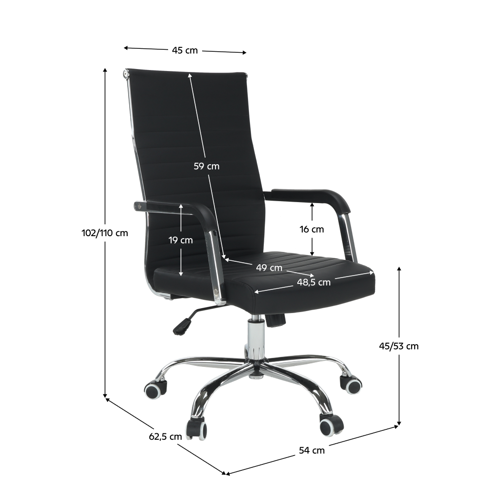 Moderné kancelárske kreslo FARANFarba: čierna/chrómMateriál: ekokoža/kovOderuodolnosť ekokože podľa testu Martindale: 100 000 oderovRozmery (ŠxHxV): 54x62,5x102-110 cmVýška sedu: 45-53 cmHĺbka sedu: 49Nosnosť: 110 kgUniverzálne kolieska vhodné na mäkké aj tvrdé podlahyDodávané v demonte.