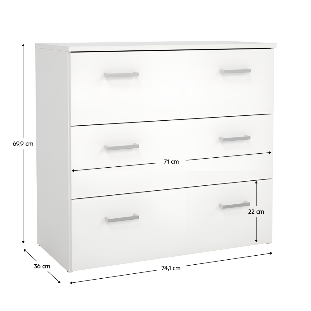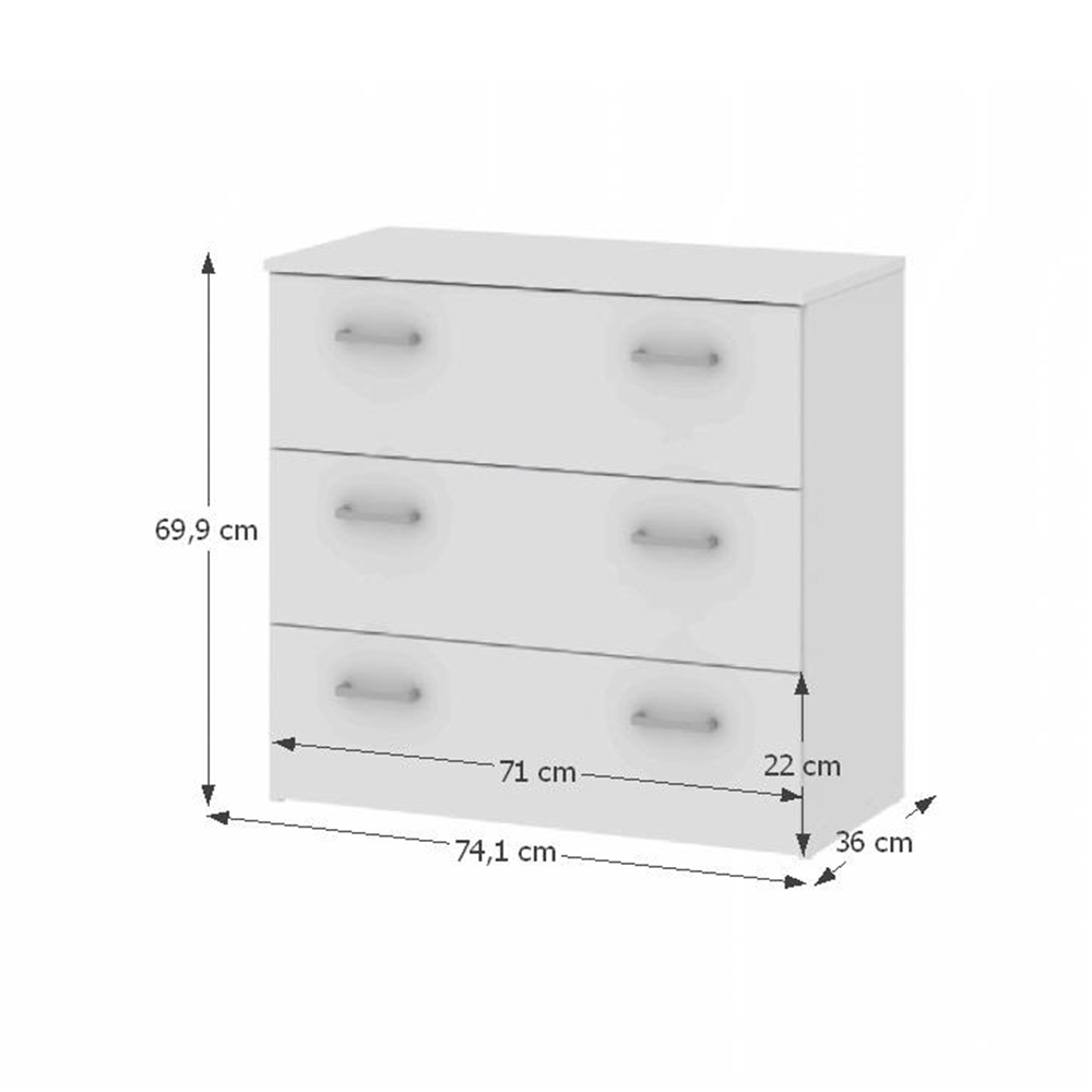 Komoda GARBO 3Materiál: DTD laminovanáPrevedenie: bielaRozmery komody (ŠxHxV): 74,1x36x69,9 cmRozmery šuplíka (ŠxV): 71x22 cmHrúbka materiálu korpus: 12 mmHrúbka materiálu vrchný plát: 15 mm3 šuplíkyDodávané v demonte