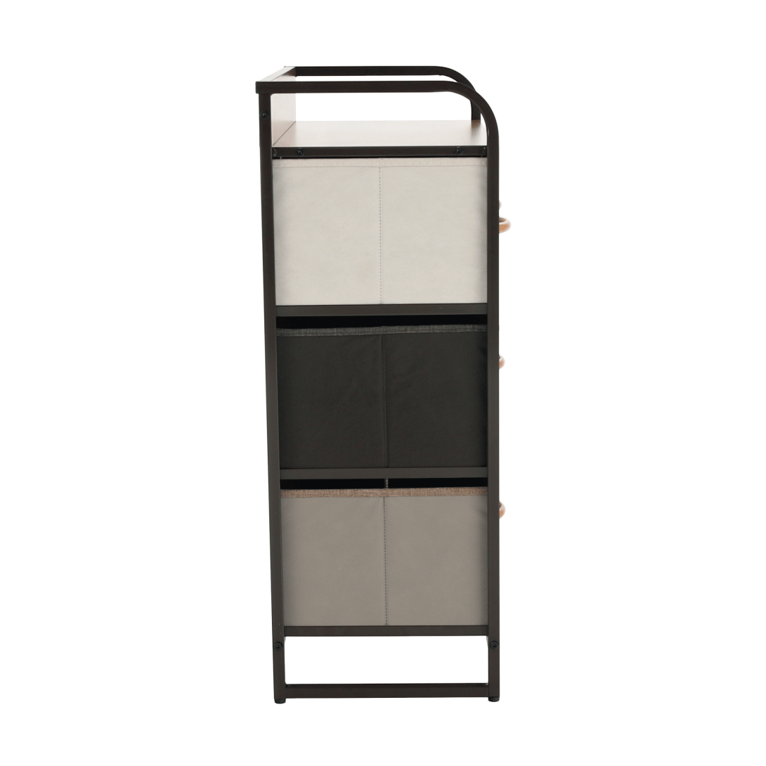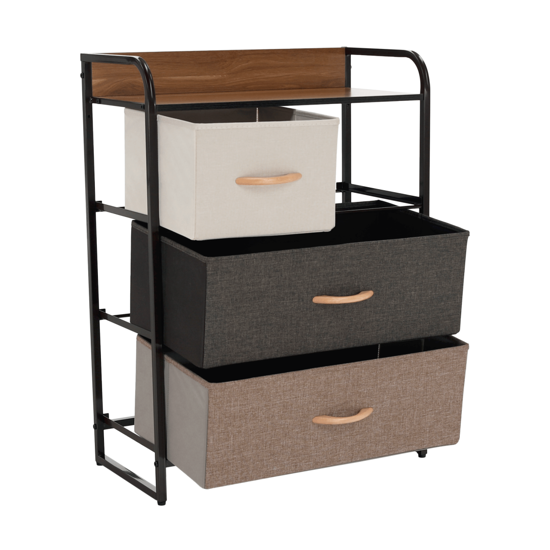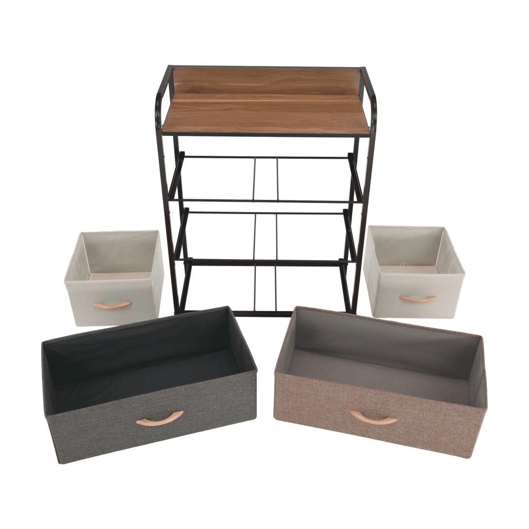 Materiál: MDF/kov/látka/plastFarba: béžová/svetlohnedá/tmavohnedáRozmery (ŠxHxV): 58x29x78,5 cmHrúbka vrchného plátu: 1,2 cmŠtyri šuplíkyKovová konštrukciaLátkové šuplíkyS drevenými úchytkamiDodávané v demonte