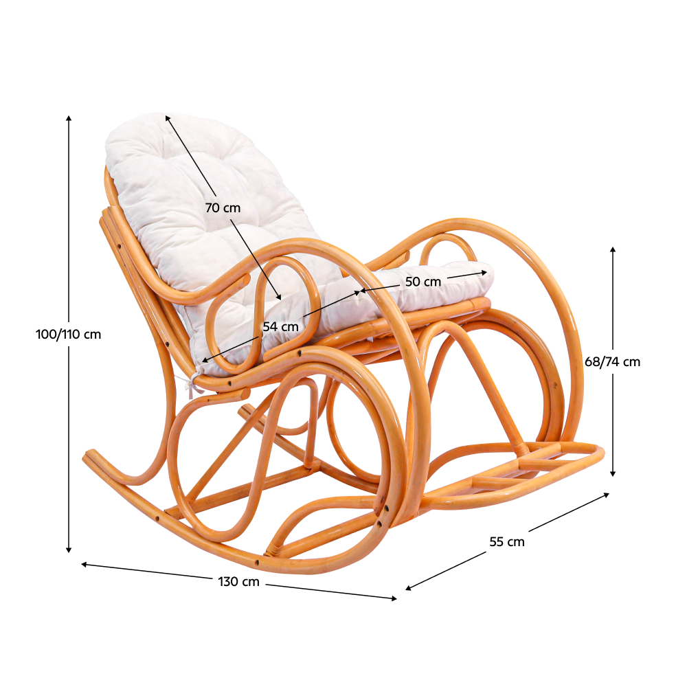 Materiál: prírodný ratan/látkaOderuodolnosť textílie podľa testu Martindale: 50 000 oderovFarba: medová/béžováRozmery (ŠxHxV): 55x130x100/110 cmVýška sedu: 68 cmHĺbka sedu: 54 cmŠírka sedu: 50 cmŠírka chrbta: 48 cmVýška chrbta: 70 cmDodávané s vankúšom Rozmer vankúša: 50x141x10 cmVýplň vankúšov: Semi DacronHrúbka vankúšov: 10 cmPoťah nie je snímateľnýNeodporúča sa pranie v práčkeNosnosť: 90 kgS podnožouHojdacieRelaxačnéPohodlnéDodávané v demonte